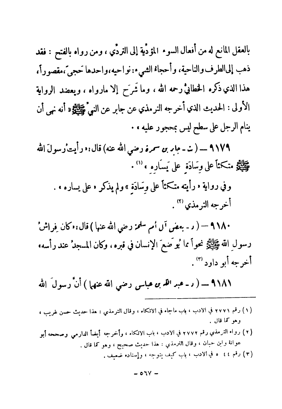 9179 - (ت) جابر بن سمرة - رضي الله عنه - قال: «رأيتُ رسول الله - صلى الله عليه وسلم- متكئاً على وِسَادَة على يَسَارِهِ» (¬1) .