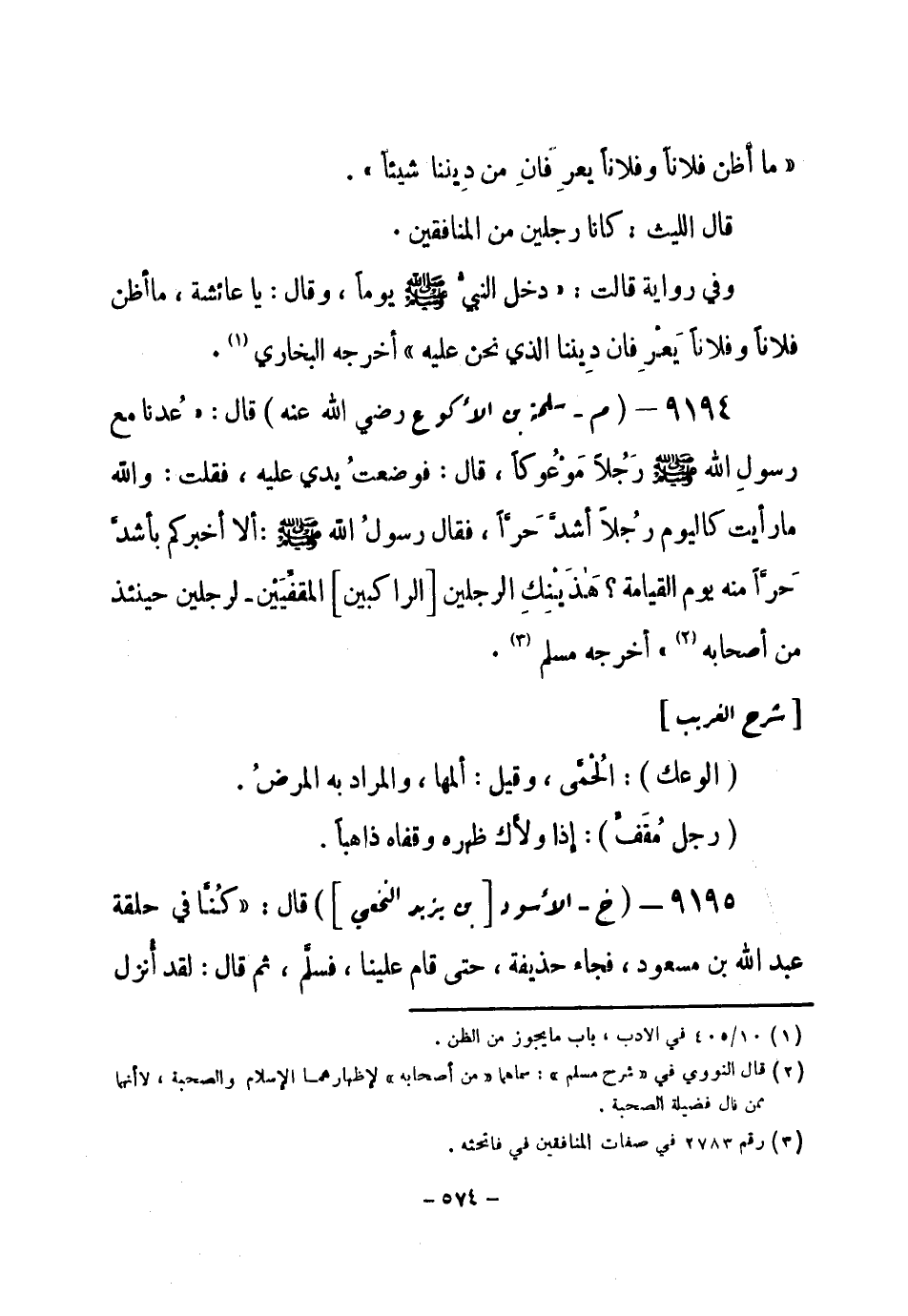 9195 - (خ) الأسود [بن يزيد النخعي] قال: «كُنَّا في حلقة عبد الله بن مسعود، فجاء حذيفة، حتى قام علينا، فسلَّم، ثم قال: لقد أُنزل -[575]- النفاق على قوم خيرٍ منكم، فقلنا: سبحان الله! فإن الله عز وجل يقول: {إنَّ المنافقينَ في الدَّرْكِ الأسفلِ من النار} [النساء: 145] فَتَبسَّم عبد الله، وجلس حذيفة في ناحية المسجد، فقام عبد الله وتفرّق أصحابه، فرماني بالحصباء، فأتيته، فقال حذيفة: عجبت من ضحكه، وقد علم ما قلتُ، لقد أنزل النفاق على قوم كانوا خيراً منكم، ثم تابوا فتاب الله عليهم» . أخرجه البخاري (¬1) .