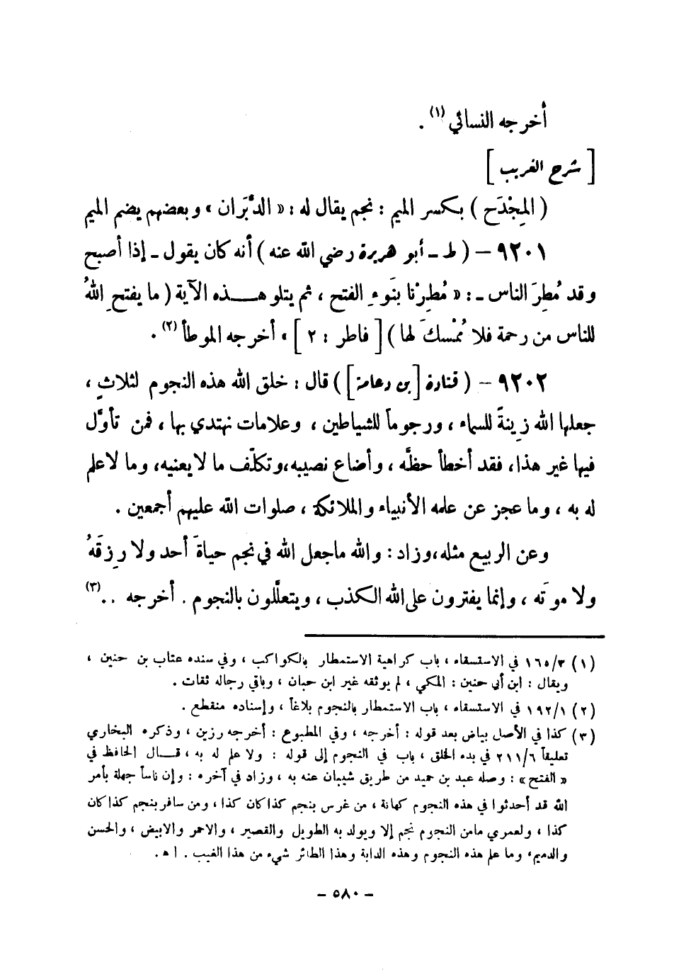 9202 - () قتادة [بن دعامة] قال: «خلق الله هذه النجوم لثلاث، جعلها الله زِينةً للسماء، ورجوماً للشياطين، وعلامات نهتدي بها، فمن تأوَّل فيها غير هذا، فقد أخطأ حظَّه، وأضاع نصيبه، وتكلّف ما لا يعنيه، وما لا علم له به، وما عجز عن علمه الأنبياء والملائكة، صلوات الله عليهم أجمعين» .