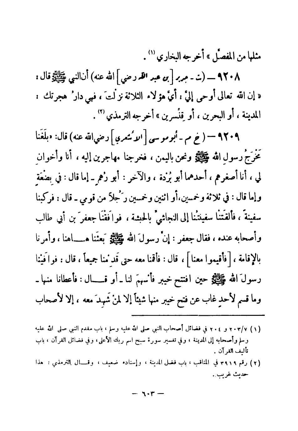 (¬1) رواه البخاري 7 / 371 - 373 في المغازي، باب غزوة خيبر، وفي الجهاد، باب من الدليل على أن الخمس لنوائب المسلمين ما سأل هوزان النبي صلى الله عليه وسلم برضاعه فيهم فتحلل من المسلمين، وفي فضائل أصحاب النبي صلى الله عليه وسلم، باب هجرة الحبشة، ومسلم رقم (2502) في فضائل الصحابة، باب من فضائل جعفر بن أبي طالب وأسماء بنت عميس وأهل سفينتهم رضي الله عنهم.