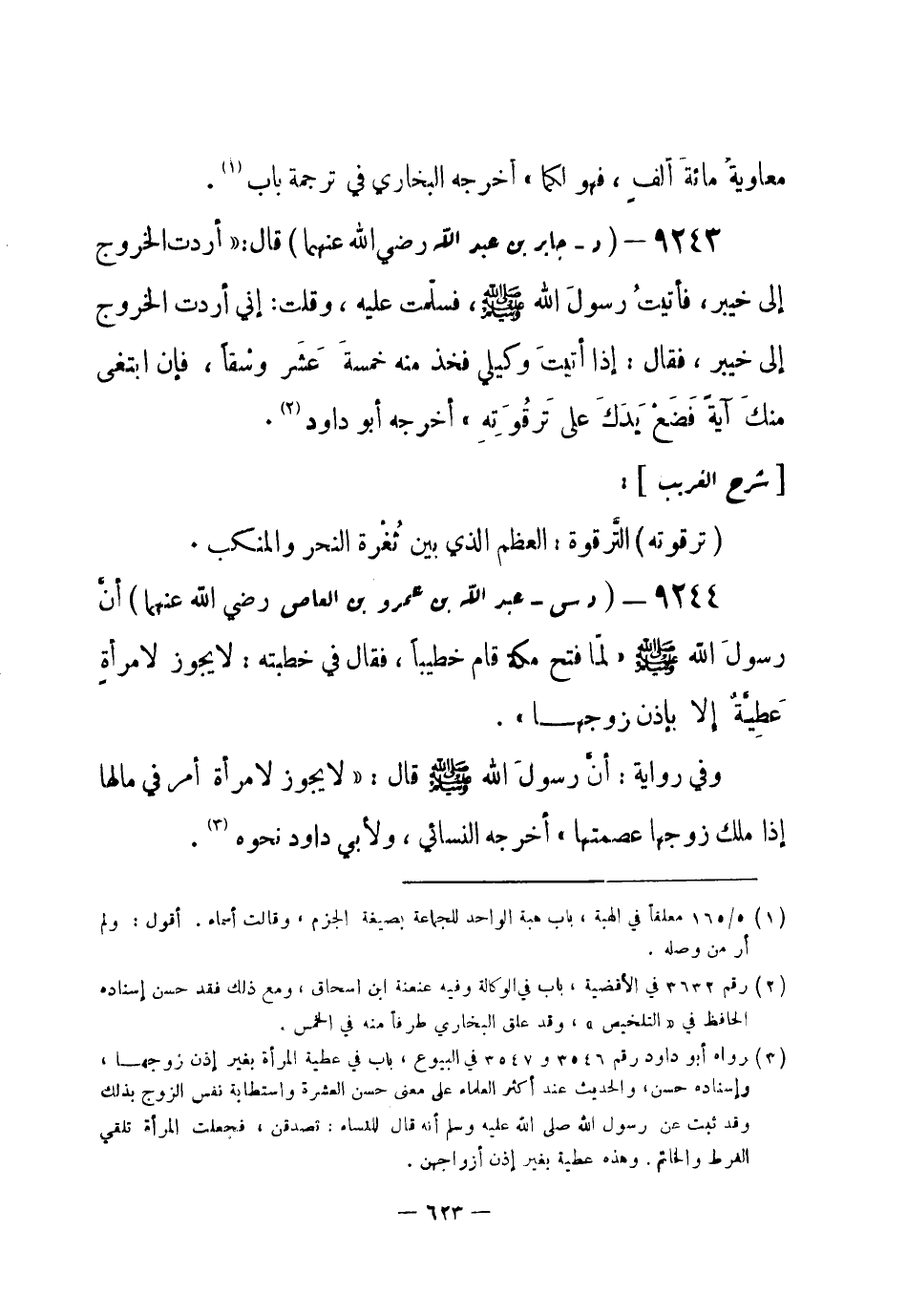 9244 - (د س) عبد الله بن عمرو بن العاص - رضي الله عنهما- أنَّ رسولَ الله - صلى الله عليه وسلم- «لمّا فتح مكة قام خطيباً فقال في خطبته: لا يجوز لامرأةٍ عَطِيَّةٌ إلا بإذن زوجها» .