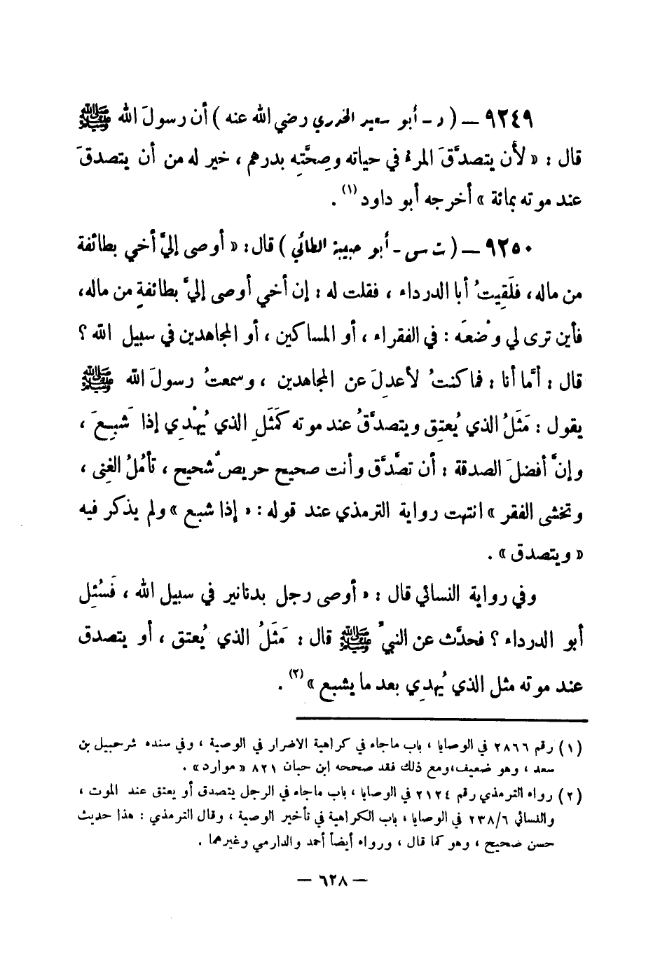 9249 - (د) أبو سعيد الخدري - رضي الله عنه - أنَّ رسولَ الله - صلى الله عليه وسلم- قال: «لأن يتصدَّق المرءُ في حياته وصِحَّته بدرهم خير له من أن يتصدقَ عند موته بمائة» أخرجه أبو داود (¬1) .