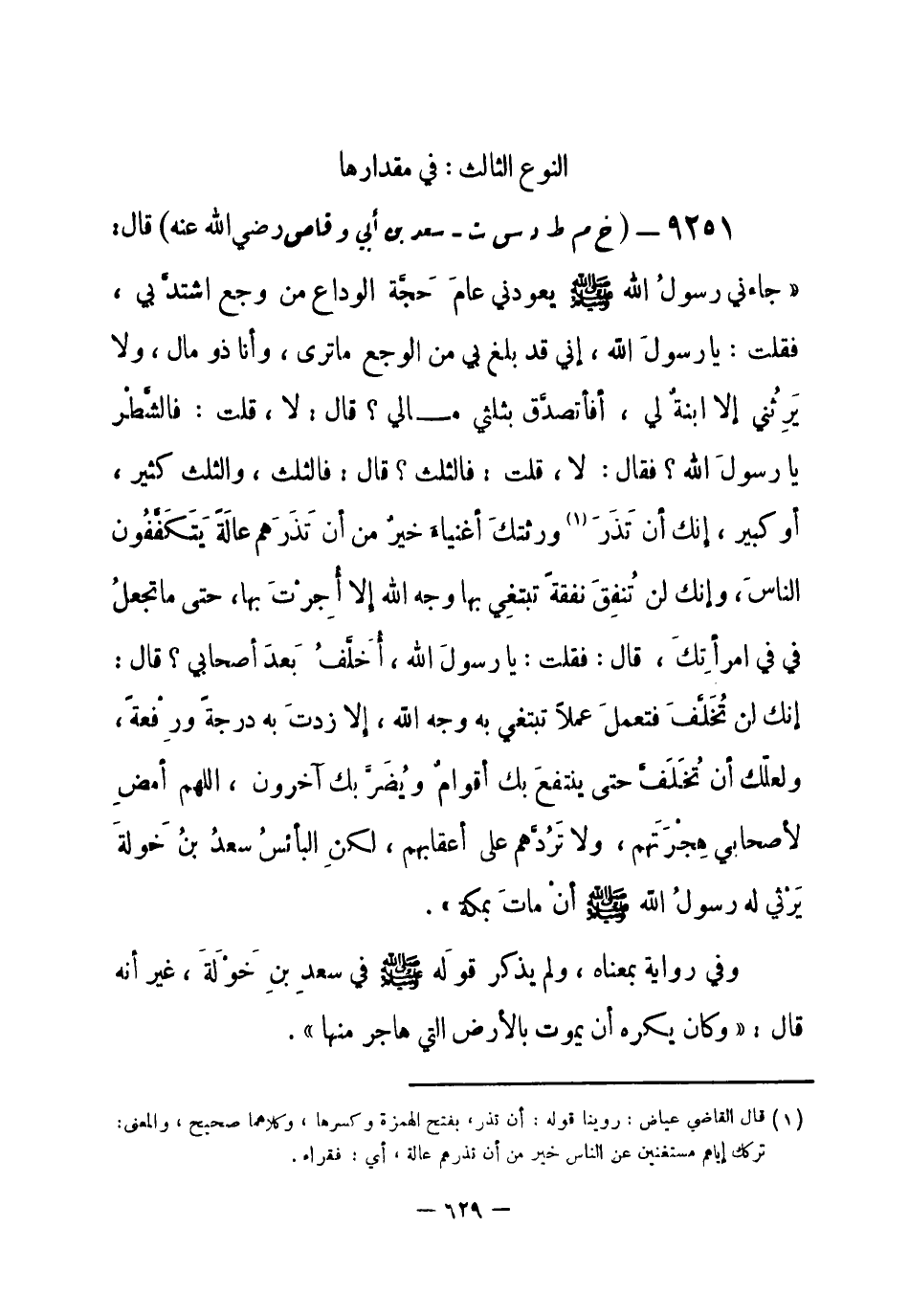 (¬3) رواه البخاري 3 / 132 في الجنائز، باب رثاء النبي صلى الله عليه وسلم سعد بن خولة، وفي الإيمان، باب ما جاء أن الأعمال بالنية والحسبة ولكل امرئ ما نوى، وفي الوصايا، باب أن يترك ورثته أغنياء خير من أن يدعهم يتكففون الناس، وباب الوصية بالثلث، وفي فضائل أصحاب النبي صلى الله عليه وسلم، باب قول النبي صلى الله عليه وسلم: " اللهم أمض لأصحابي هجرتهم "، وفي المغازي، باب حجة الوداع، وفي النفقات في فاتحته، وفي المرضى، باب وضع اليد على المريض، وباب قول المريض: إني وجع، وفي الدعوات، باب الدعاء برفع الوباء والوجع، وفي الفرائض، باب ميراث البنات، ومسلم رقم (1628) في الوصية، باب الوصية بالثلث، والموطأ 2 / 763 في الوصية، باب الوصية في الثلث لا تتعدى، والترمذي رقم (975) في الجنائز، باب ما جاء في الوصية بالثلث والربع، وفي الوصايا، باب ما جاء في الوصية بالثلث، وأبو داود رقم (2864) في الوصايا، باب ما جاء فيما لا يجوز للوصي في ماله، والنسائي 6 / 241 - 243 في الوصايا، باب الوصية بالثلث.