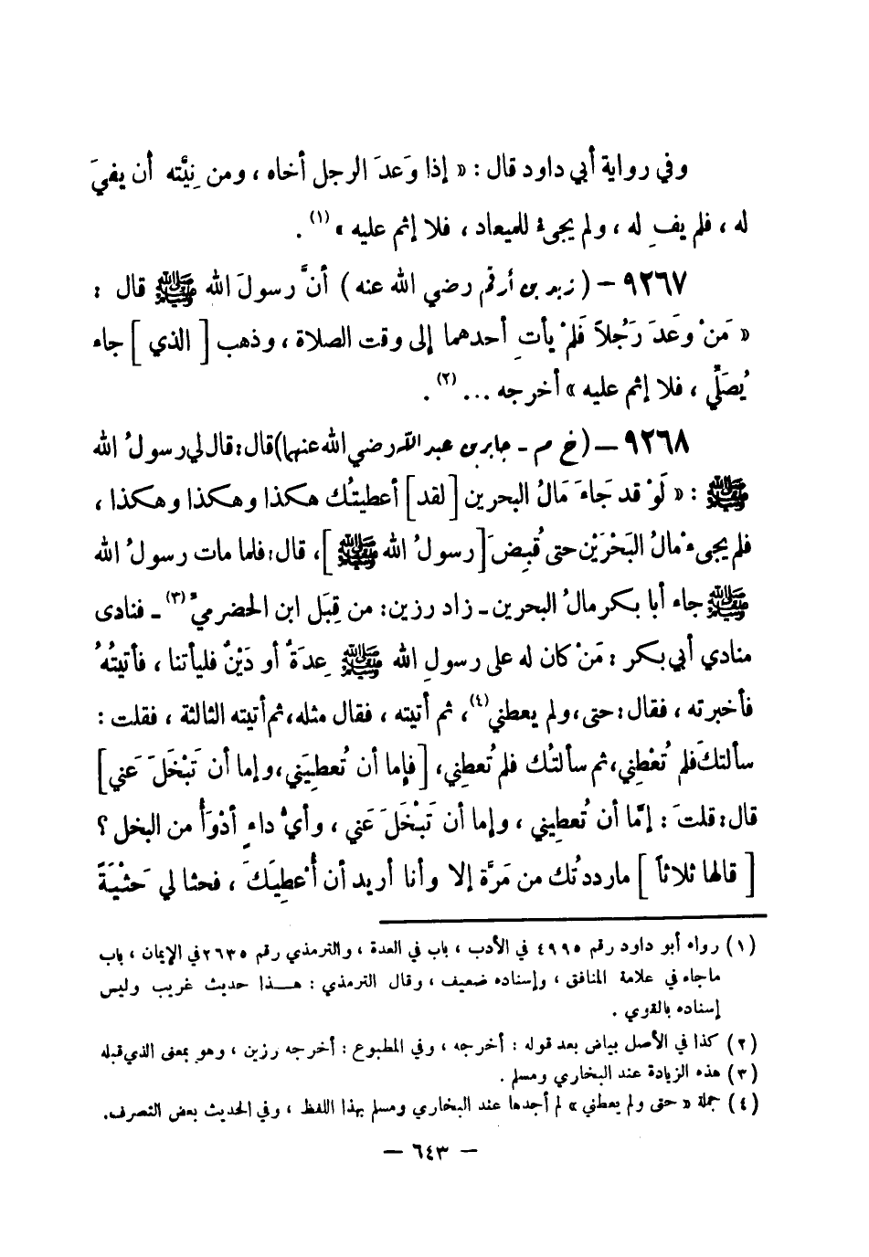 9267 - () زيد بن أرقم - رضي الله عنه - أنَّ رسولَ الله - صلى الله عليه وسلم- قال: «مَنْ وعَدَ رَجُلاً فَلمْ يأتِ أحدهما إلى وقت الصلاة، وذهب [الذي] جاء يُصَلِّي فلا إثم عليه» أخرجه ... (¬1) .