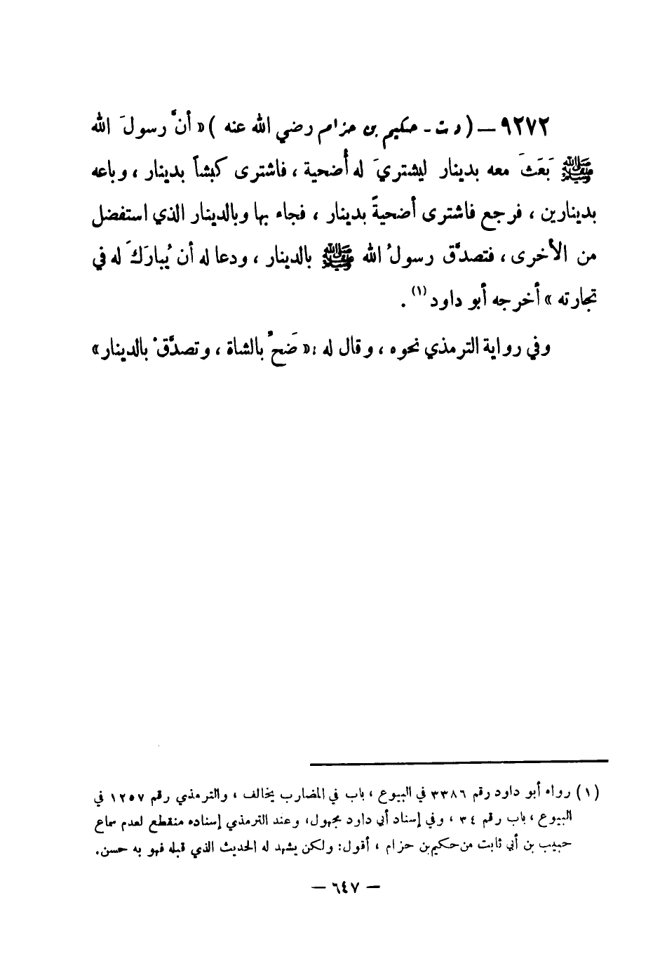 9272 - (د ت) حكيم بن حزام - رضي الله عنه - «أنَّ رسولَ الله - صلى الله عليه وسلم- بَعَثَ معه بدينار ليشتري له أُضحية، فاشترى كبشاً بدينار، وباعه بدينارين، فرجع فاشترى أضحية بدينار، فجاء بها وبالدينار الذي استفضل من الأخرى، فتصدَّق رسولُ الله - صلى الله عليه وسلم- بالدينار، ودعا له أن يُبارَكَ له في تجارته» أخرجه أبو داود (¬1) .