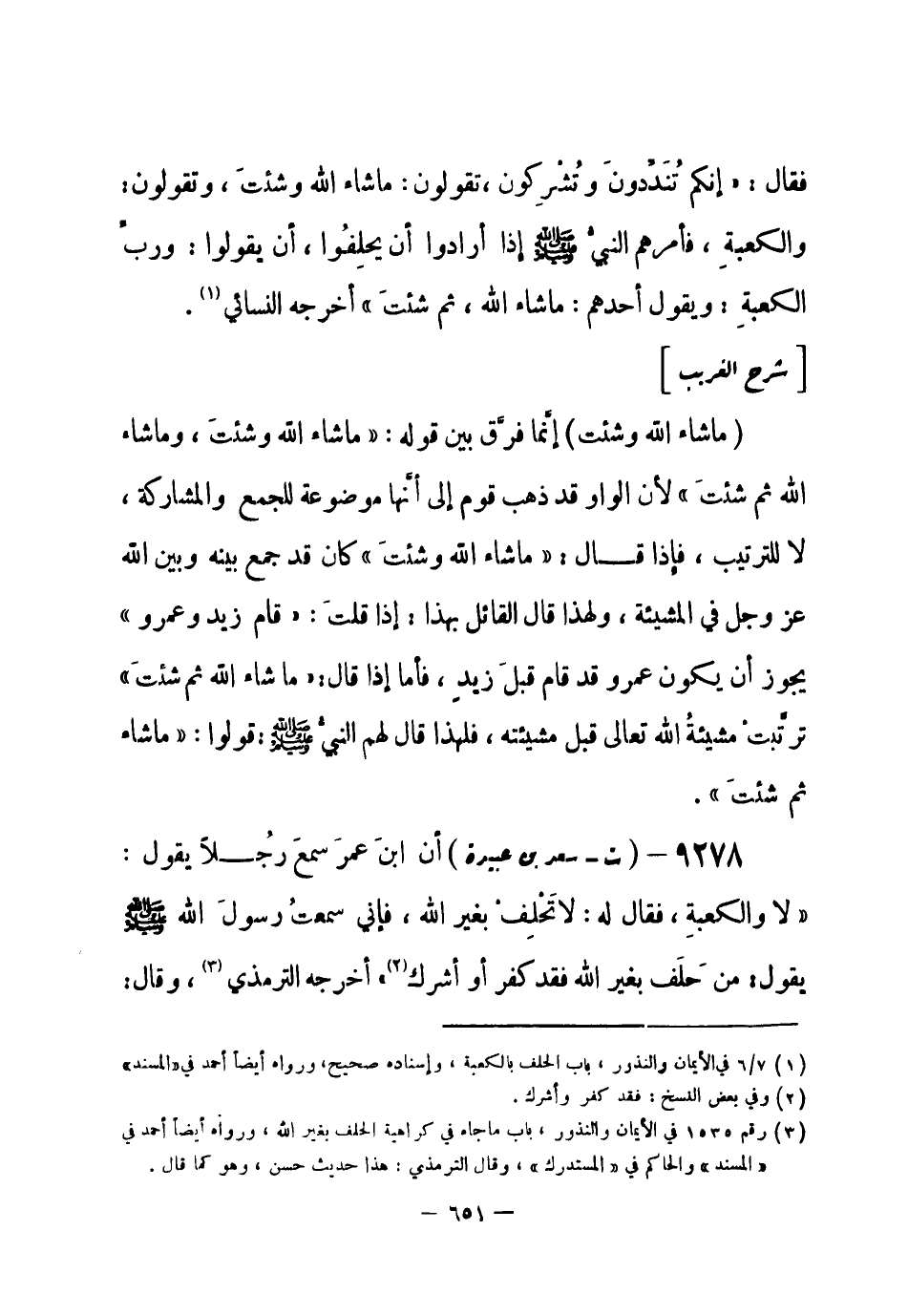 9278 - (ت) سعد بن عبيدة أن ابن عمر سمعَ رجُلاً يقول: لا والكعبة، فقال له: لا تَحْلِفْ بغير الله، فإني سمعتُ رسولَ الله - صلى الله عليه وسلم- يقول: «من حلفَ بغير الله فقد كفر أو أشرك (¬1) » أخرجه الترمذي (¬2) ، وقال: -[652]- هذا على التغليظ.
