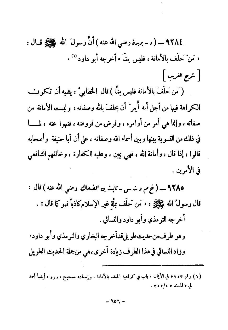 9284 - (د) بريدة - رضي الله عنه - أنَّ رسولَ الله - صلى الله عليه وسلم- قال: «مَنْ حَلَف بالأمانة فليس مِنّا» أخرجه أبو داود (¬1) .
