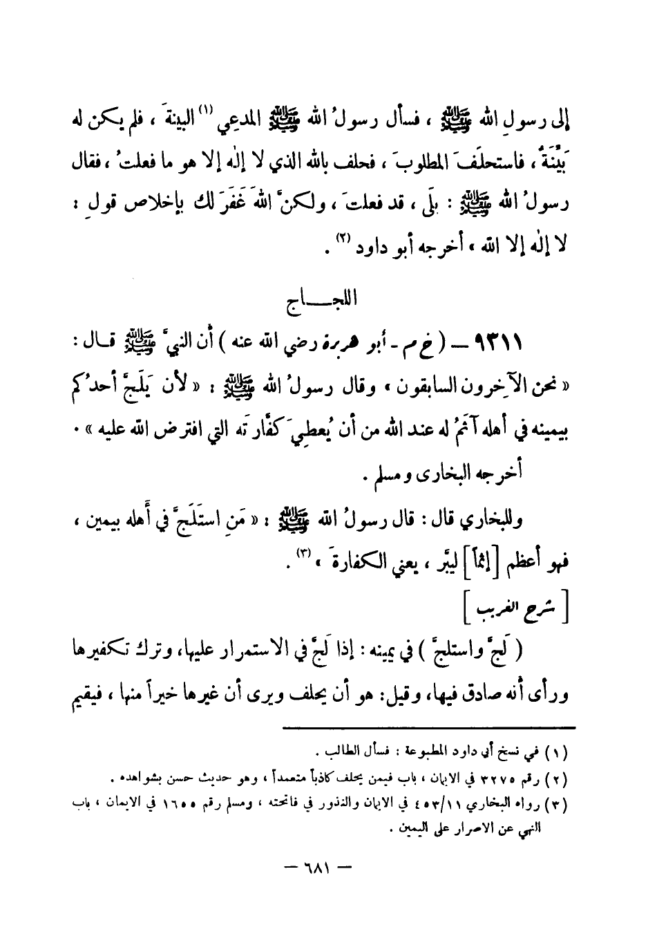 9311 - (خ م) أبو هريرة - رضي الله عنه - أن النبيَّ - صلى الله عليه وسلم- قال: «نحن الآخِرون السابقون» وقال رسولُ الله - صلى الله عليه وسلم-: «لأن يَلَجَّ أحدُكم بيمينه في أهله آثَمُ له عند الله من أن يُعطِي كفَّارتَه التي افترض الله عليه» . أخرجه البخاري ومسلم.