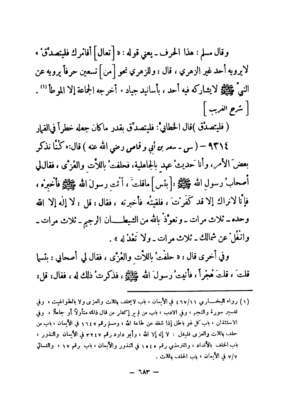9314 - (س) سعد بن أبي وقاص - رضي الله عنه - قال: «كُنَّا نذكر بعضَ الأمر، وأنا حَديثُ عهدٍ بالجاهلية، فحلفتُ باللات والعُزَّى، فقال لي أصحابُ رسولِ الله - صلى الله عليه وسلم-: [بئس] ما قلتَ، ائْتِ رسولَ الله - صلى الله عليه وسلم- فأخْبِرْه، فإنا لا نراك إلا قد كَفَرْتَ، فلقيتُه فأخبرته، فقال: قل: لا إله إلا الله وحده - ثلاث مرات - وتعوَّذْ بالله من الشيطان الرجيم - ثلاث مرات - واتْفُلْ عن شمالك - ثلاث مرات -، ولا تَعُدْ له» .