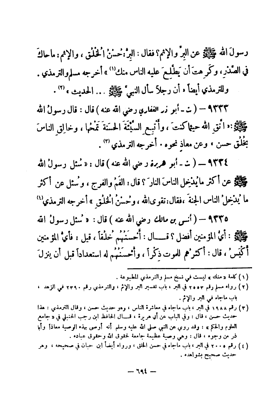 9334 - (ت) أبو هريرة - رضي الله عنه - قال: «سُئل رسولُ الله - صلى الله عليه وسلم- عن أكثر ما يُدْخِل الناسَ النار؟ قال: الفَمُ والفرج، وسُئل عن أكثر ما يُدْخِلُ الناس الجنة، قال: تقوى الله، وحسن الخُلقُ» أخرجه الترمذي (¬1) .