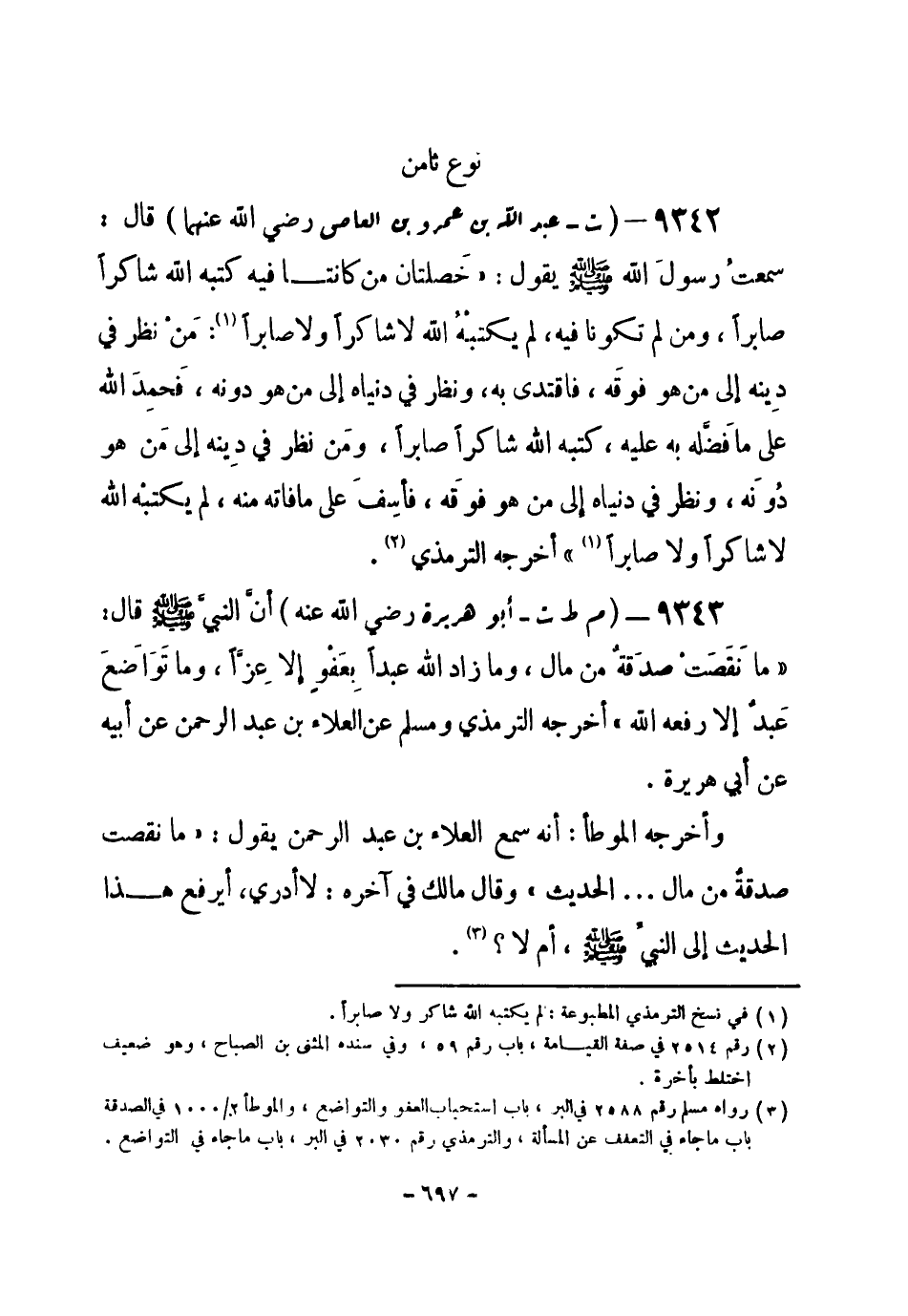 9342 - (ت) عبد الله بن عمرو بن العاص - رضي الله عنهما - قال: سمعتُ رسولَ الله - صلى الله عليه وسلم- يقول: «خَصلتان من كانتا فيه كتبه الله شاكراً صابراً، ومن لم تكونا فيه لم يكتبه الله لا شاكراً ولا صابراً (¬1) : مَن نظر في دِينه إلى من هو فوقَه، فاقتدى به، ونظر في دنياه إلى من هو دونه، فَحَمِدَ الله على ما فَضَّله به عليه، كتبه الله شاكراً صابراً، ومَن نظر في دِينه إلى مَن هو دُونَه، ونظر في دنياه إِلى من هو فوقه، فأَسِفَ على ما فاته منه، لم يكتبه الله لا شاكراً ولا صابراً (¬1) » أخرجه الترمذي (¬2) .
