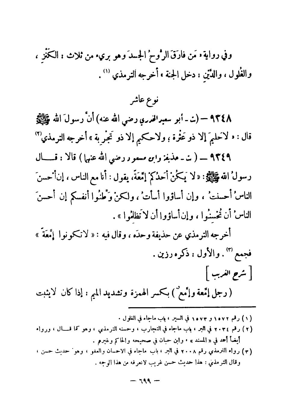 9349 - (ت) حذيفة وابن مسعود - رضي الله عنهما - قالا: قال رسولُ الله - صلى الله عليه وسلم-: «لا يكُنْ أحَدُكمْ إمَّعَة، يقول: أنا مع الناس، إن أحْسنَ الناسُ أحسنتُ، وإن أساؤوا أسأتُ، ولكن وَطِّنُوا أنفسكم إن أحسنَ الناسُ أن تُحْسِنُوا، وإن أساؤوا أن لا تَظلِمُوا» .