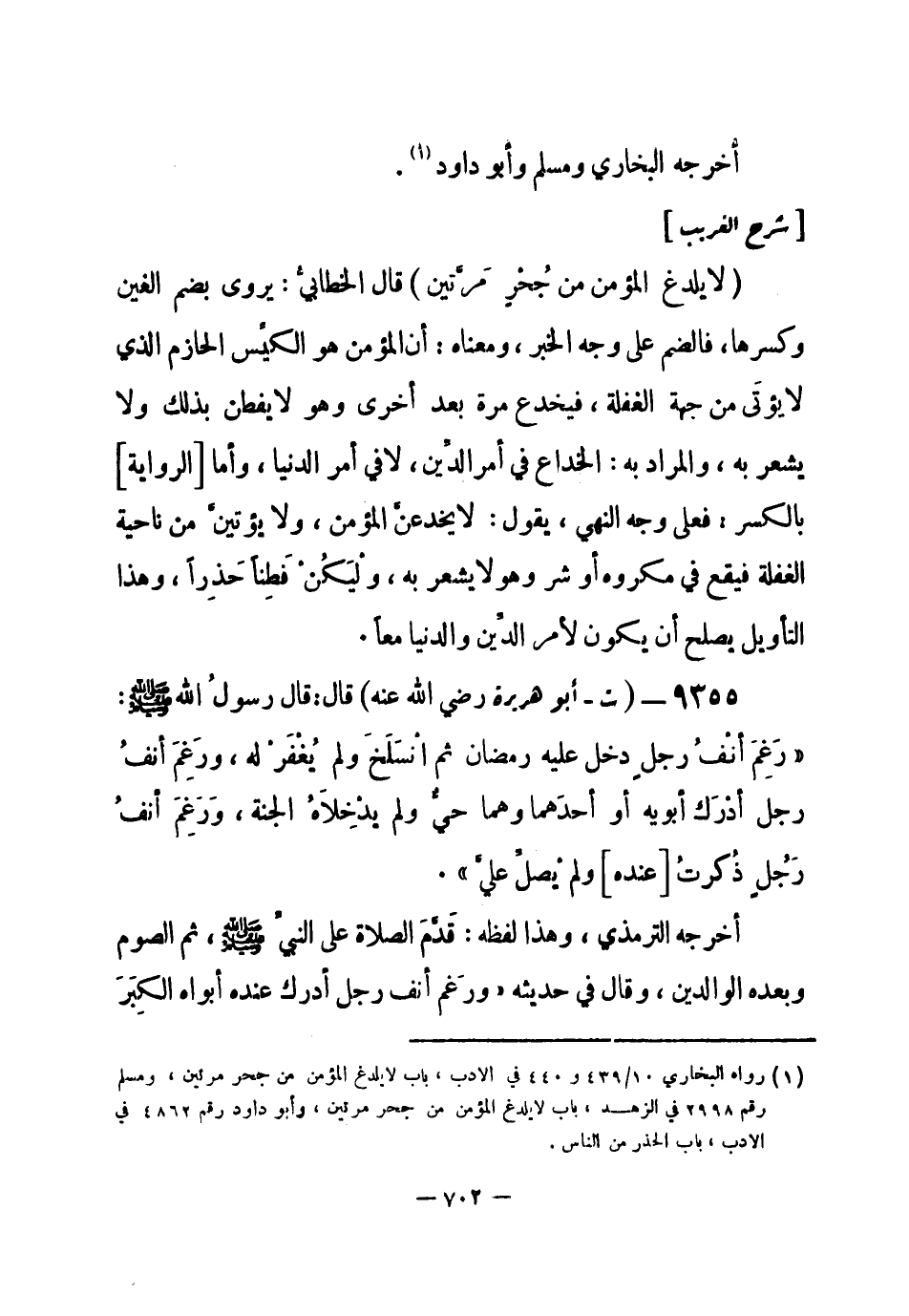 9355 - (ت) أبو هريرة - رضي الله عنه - قال: قال رسولُ الله - صلى الله عليه وسلم-: «رَغِمَ أنْفُ رجل دخل عليه رمضان ثم انْسَلَخَ ولم يُغْفَرْ لَه، ورَغِمَ أنفُ رجل أدْرَك أبويه أو أحدَهما وهما حيٌّ ولم يدْخِلاهُ الجنة، وَرَغِمَ أنفُ رَجُلٍ ذُكرتُ [عنده] ولم يُصلِّ عليَّ» .