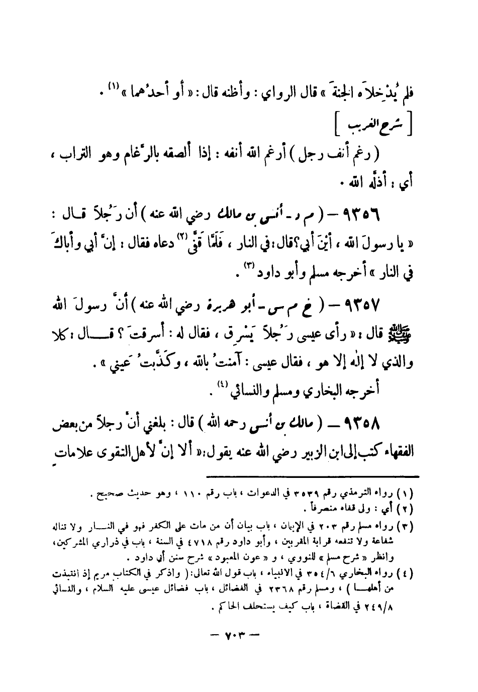 9356 - (م د) أنس بن مالك - رضي الله عنه - أن رَجُلاً قال: «يا رسولَ الله، أيْنَ أبي؟ قال: في النار، فَلَمَّا قَفَّى (¬1) دعاه فقال: إن أبي وأباك في النار» أخرجه مسلم وأبو داود (¬2) .