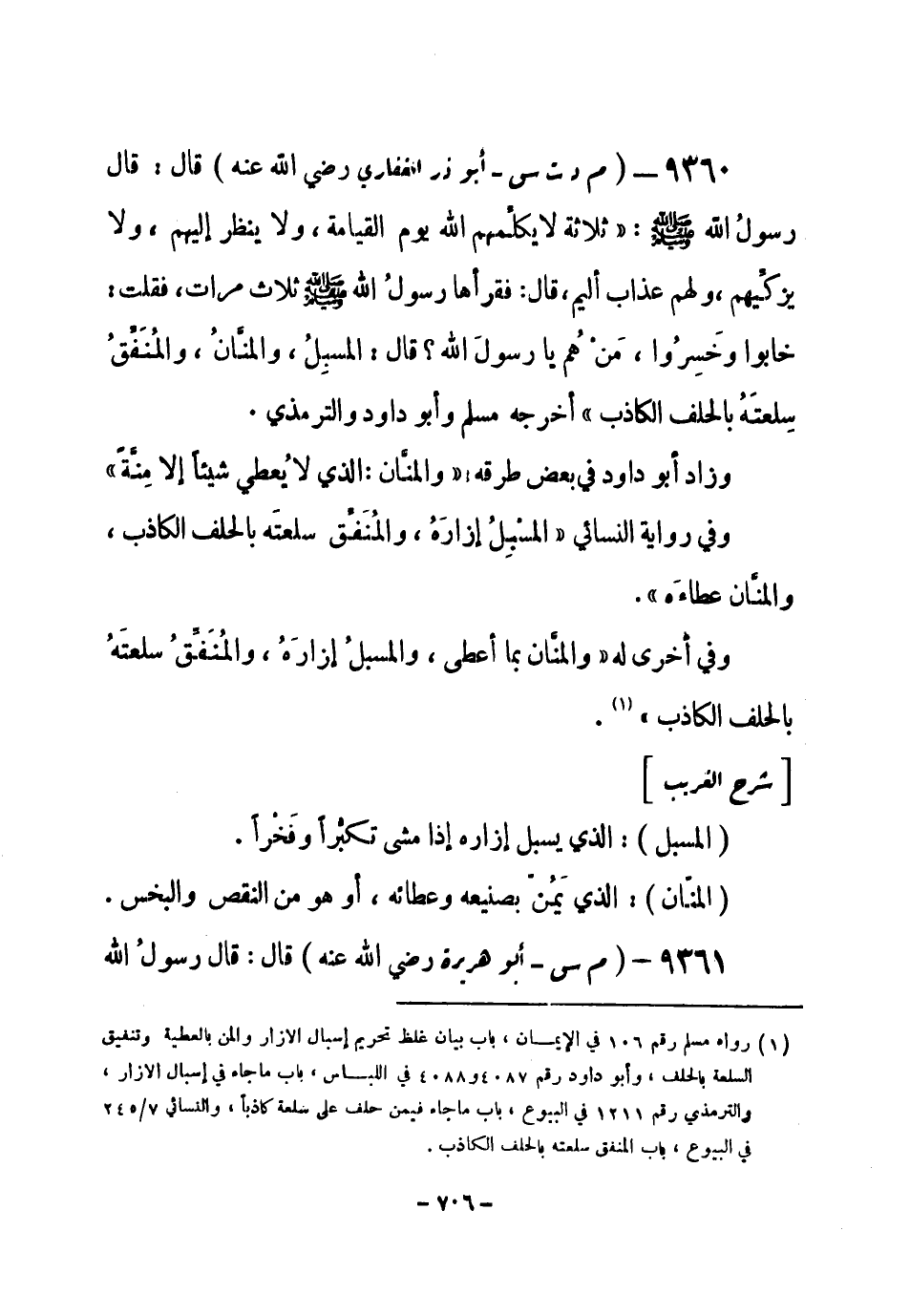 9360 - (م د ت س) أبو ذر الغفاري - رضي الله عنه - قال: قال رسولُ الله - صلى الله عليه وسلم-: «ثلاثة لا يكلِّمهم الله يوم القيامة، ولا ينظر إليهم، ولا يزكِّيهم، ولهم عذاب أليم، قال: فقرأها رسولُ الله - صلى الله عليه وسلم- ثلاث مرات، فقلت: خابوا وخَسِرُوا، مَنْ هُم يا رسول الله؟ قال: المسبِلُ، والمنَّان، والمُنَفِّقُ سِلعتَهُ بالحلف الكاذب» أخرجه مسلم وأبو داود والترمذي.
