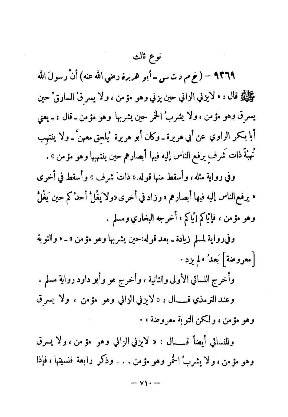9369 - (خ م د ت س) أبو هريرة - رضي الله عنه - أنَّ رسولَ الله - صلى الله عليه وسلم- قال: «لا يزني الزاني حين يزني وهو مؤمن، ولا يسرِقُ السارق حين يسرِق وهو مؤمن، ولا يشربُ الخمر حين يشربها وهو مؤمن - قال: يعني أبا بكر الراوي عن أبي هريرة وكان أبو هريرة يُلحِق معهنَّ - ولا ينتهِب نُهْبة ذات شَرف يرفع الناس إليه فيها أبصارهم حين ينتهبها وهو مؤمن» .