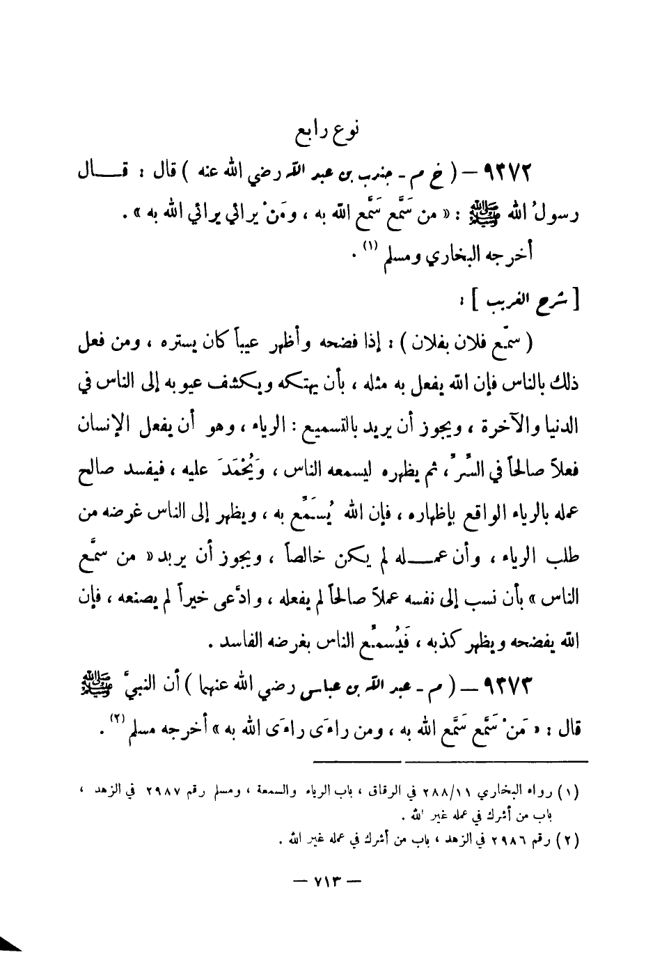 9373 - (م) عبد الله بن عباس - رضي الله عنهما - أن النبيَّ - صلى الله عليه وسلم- قال: «مَنْ سَمَّع سَمَّع الله به، ومن راءَى راءَى الله بهِ» أخرجه مسلم (¬1) .