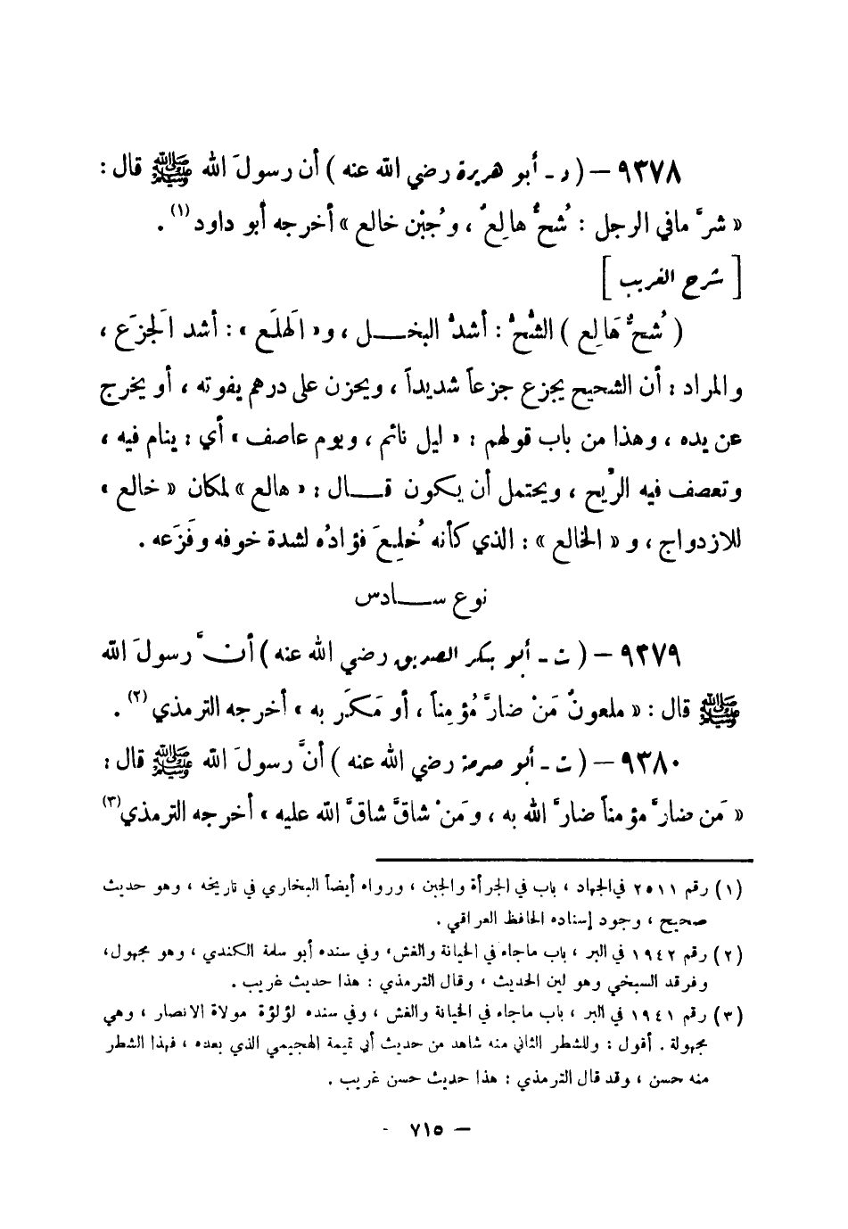 9378 - (د) أبو هريرة - رضي الله عنه - أن رسولَ الله - صلى الله عليه وسلم- قال: «شرَّ ما في الرجل: شُحٌّ هَالِع، وجُبْن خالع» أخرجه أبو داود (¬1) .