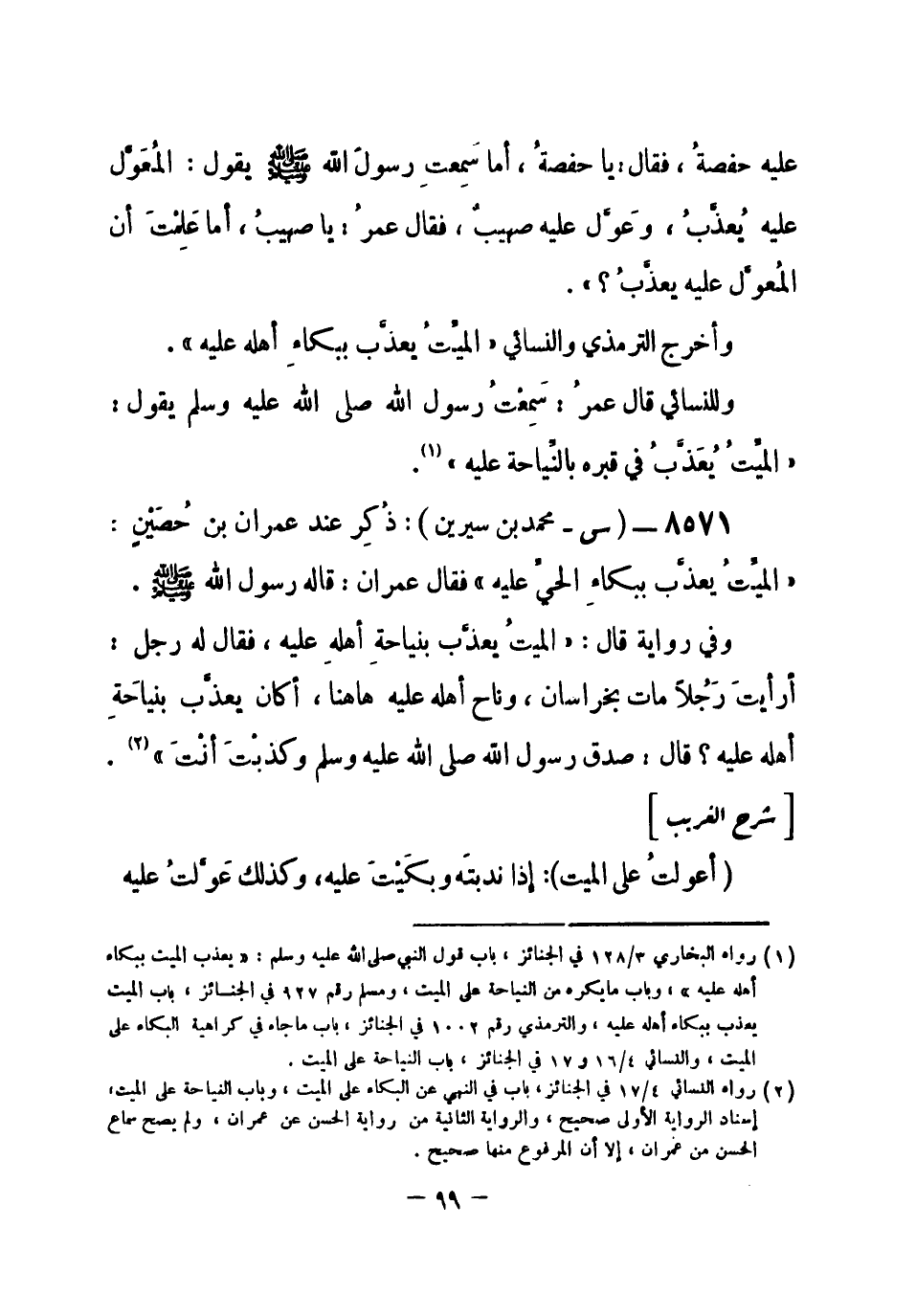 (¬1) رواه النسائي 4 / 17 في الجنائز، باب في النهي عن البكاء على الميت، وباب النياحة على الميت، إسناد الرواية الأولى صحيح، والرواية الثانية من رواية الحسن عن عمران، ولم يصح سماع الحسن من عمران، إلا أن المرفوع منها صحيح.