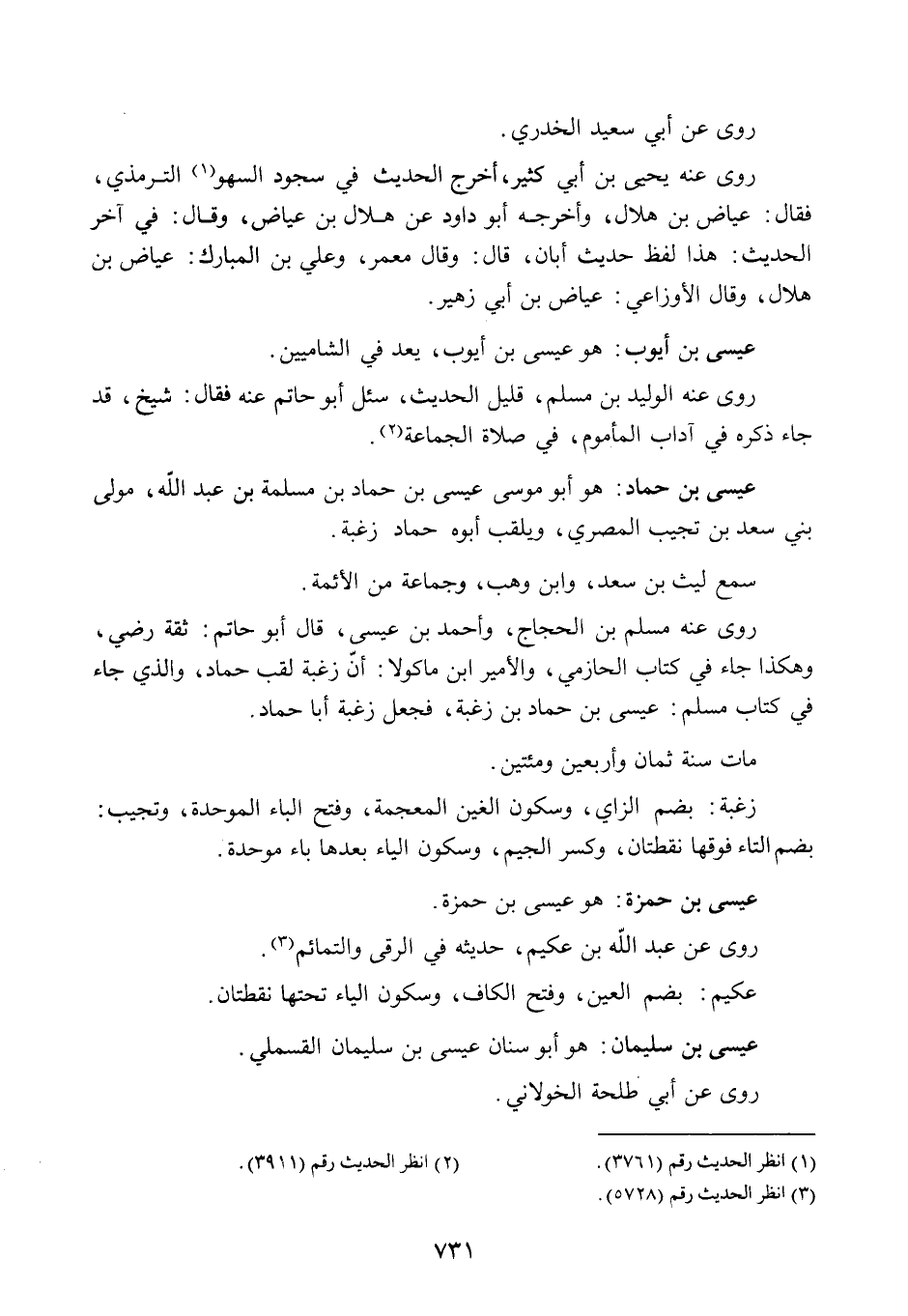 روى عنه مُسْلِم بن الحَجَّاج، وأحمد بن عيسى. قال أبو حاتم: ثقة، رضي. وهكذا جاء في كتاب الحازمي، والأمير ابن ماكولا: أن زغبة لقب حماد. والذي جاء في «كتاب مسلم» : عيسى بن حمَّاد بن زُغْبة فجعل زُغْبة أبا حماد.