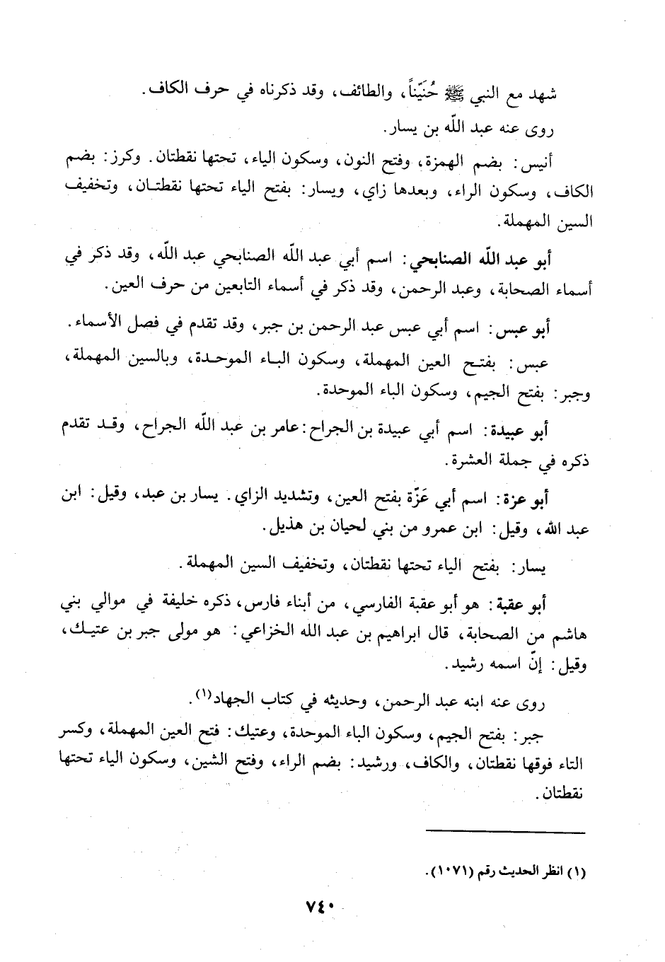 اسم أبي عبد الله الصُّنَابحي: عبد الله، وقد ذكر في أسماء الصحابة، وعبد الرحمن، وقد ذكر في أسماء التابعين من حرف العين.