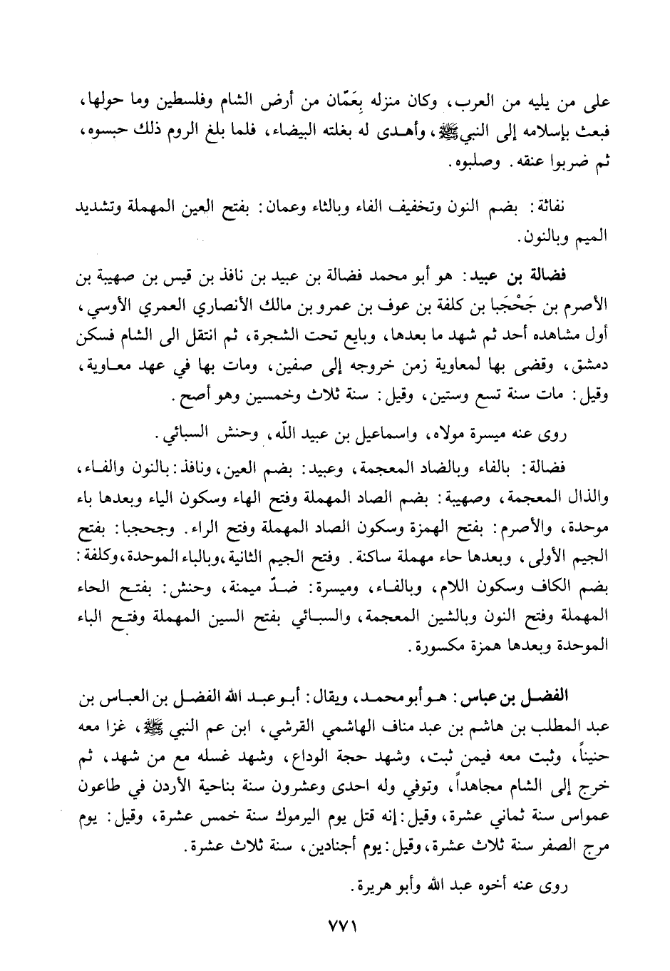 هو أبو محمد، ويقال: أبو عبد الله، الفَضْل بن العباس بن عبد المطلب بن هاشم بن عبد مَناف الهاشمي القرشي، ابن عمِّ النبي - صلى الله عليه وسلم-. غزا معه حنيناً، وثبت معه فيمن ثبت، وشهد حجة الوداع، وشهد غسلَه مع من شهد، ثم خرج إلى الشام مجاهداً، وتوفي وله إحدى وعشرون سنة بناحية الأُردن في طاعون عَمَواس سنة ثماني عشرة، وقيل: إنه قتل يوم اليرموك سنة خمس عشرة، وقيل: يوم مَرْج الصُّفَّر سنة ثلاث عشرة وقيل: يوم أجنادين سنة ثلاث عشرة.