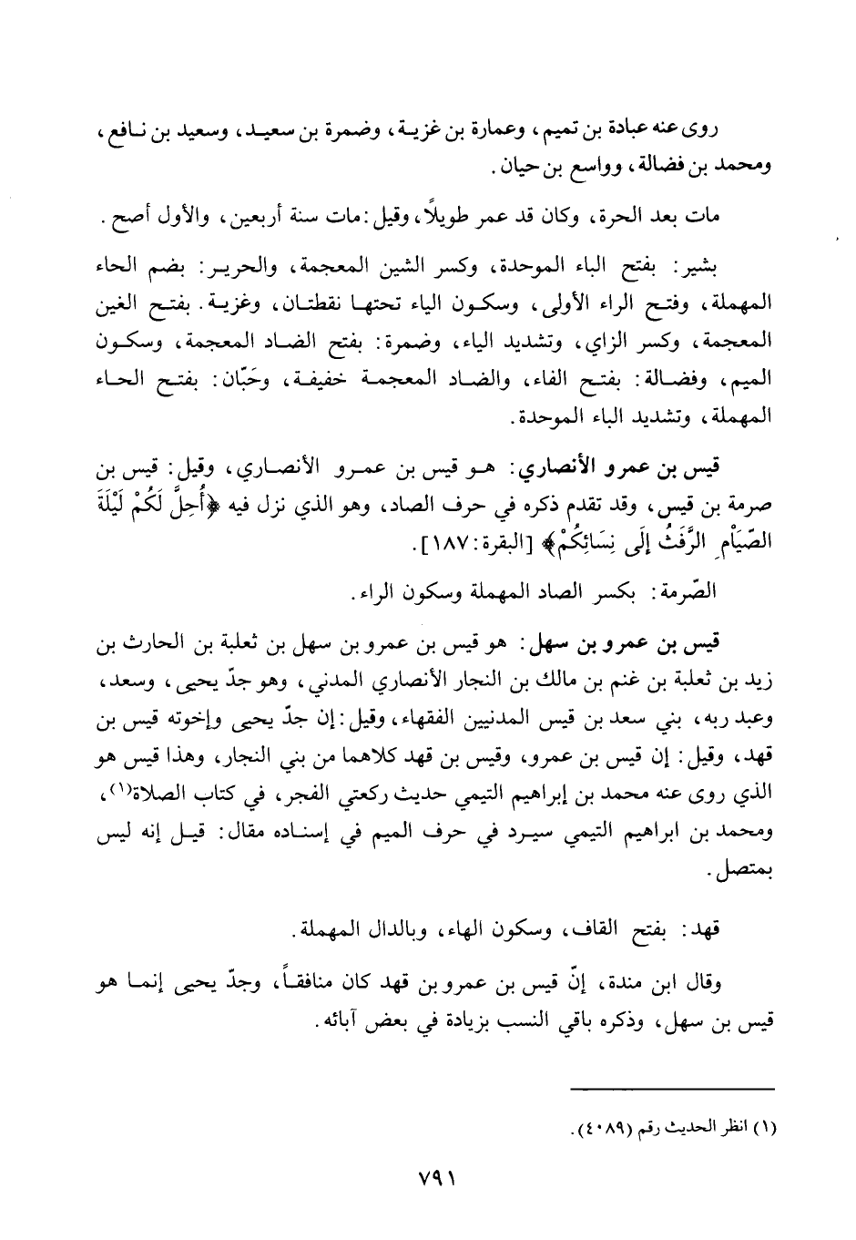 هو قيس بن عمرو بن سهل بن ثعلبة بن الحارث بن زيد بن ثعلبة بن غنم بن مالك بن النجار الأنصاري المدني، وهو جد يحيى، وسعد، وعبد ربه بني سعد بن قيس المدنيين الفقهاء. وقيل: إنَّ جد يحيى وإخوته قيس بن قهد، وقيل: إن قيس بن عمرو، وقيس بن قهد كلاهما من بني النجار، وهذا قيس هو الذي روى عنه محمد بن إبراهيم التيمي حديث ركعتي الفجر في كتاب الصلاة (¬1) ، ومحمد بن إبراهيم التيمي، سيرد في حرف الميم، في إسناده مقال: قيل إنه ليس بمتصل.
