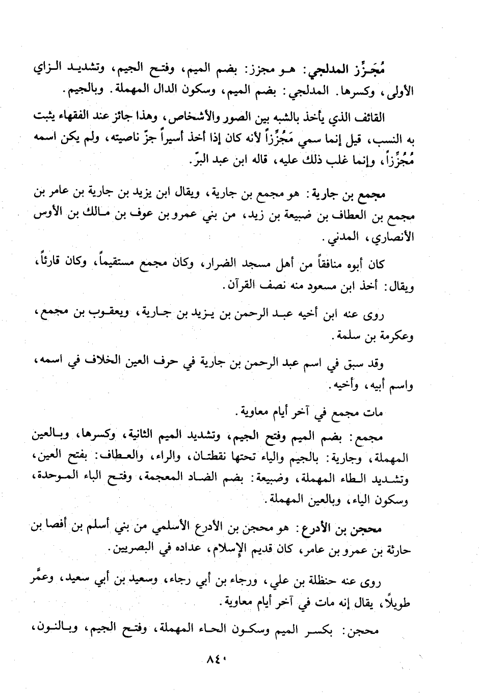 مُجَمِّع: بضم الميم، وفتح الجيم، وتشديد الميم الثانية وكسرها، وبالعين المهملة. وجارية: بالجيم، والياء تحتها نقطتان، والراء. والعَطَّاف: بفتح العين، وتشديد الطاء المهملة. وضُبَيْعة: بضم الضاد المعجمة، وفتح الباء الموحدة، وسكون الياء، وبالعين المهملة.
