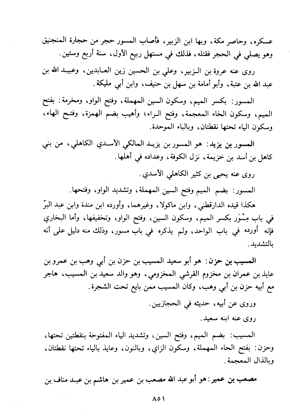 هكذا قيَّده الدارقطني، وابن ماكولا وغيرُهما. وأورده ابنُ مندَة وابنُ عبد البر في باب مِسْوَر بكسر الميم، وسكون السين، وفتح الواو وتخفيفها. وأمَّا البخاريُّ فإنه أوردَهُ في باب الواحدِ ولم يذكْره في بابِ مِسْوَر وذلك منه دليل على أنه بالتشديد.