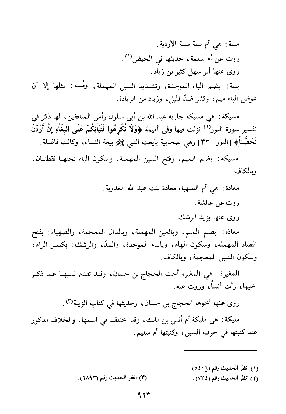 M (2655) الاستيعاب (1913) ، معاذة بنت عبد الله وقيل: مسيكة، الأسماء المبهمة (510) ، غوامض الأسماء (1/346) ((وقيل اسمها: معينة وقيل: معاذة)) ، أسد الغابة (7/265) تهذيب الكمال (1698) ، الكاشف (3/435) ، ميزان الاعتدال (4/610) ، العقد الثمين (8/317) ، تهذيب التهذيب (12/451) ، تقريب التهذيب (2/614) ، الإصابة (4/408) ، مسكة ويقال: مسيكة بالتصغير.