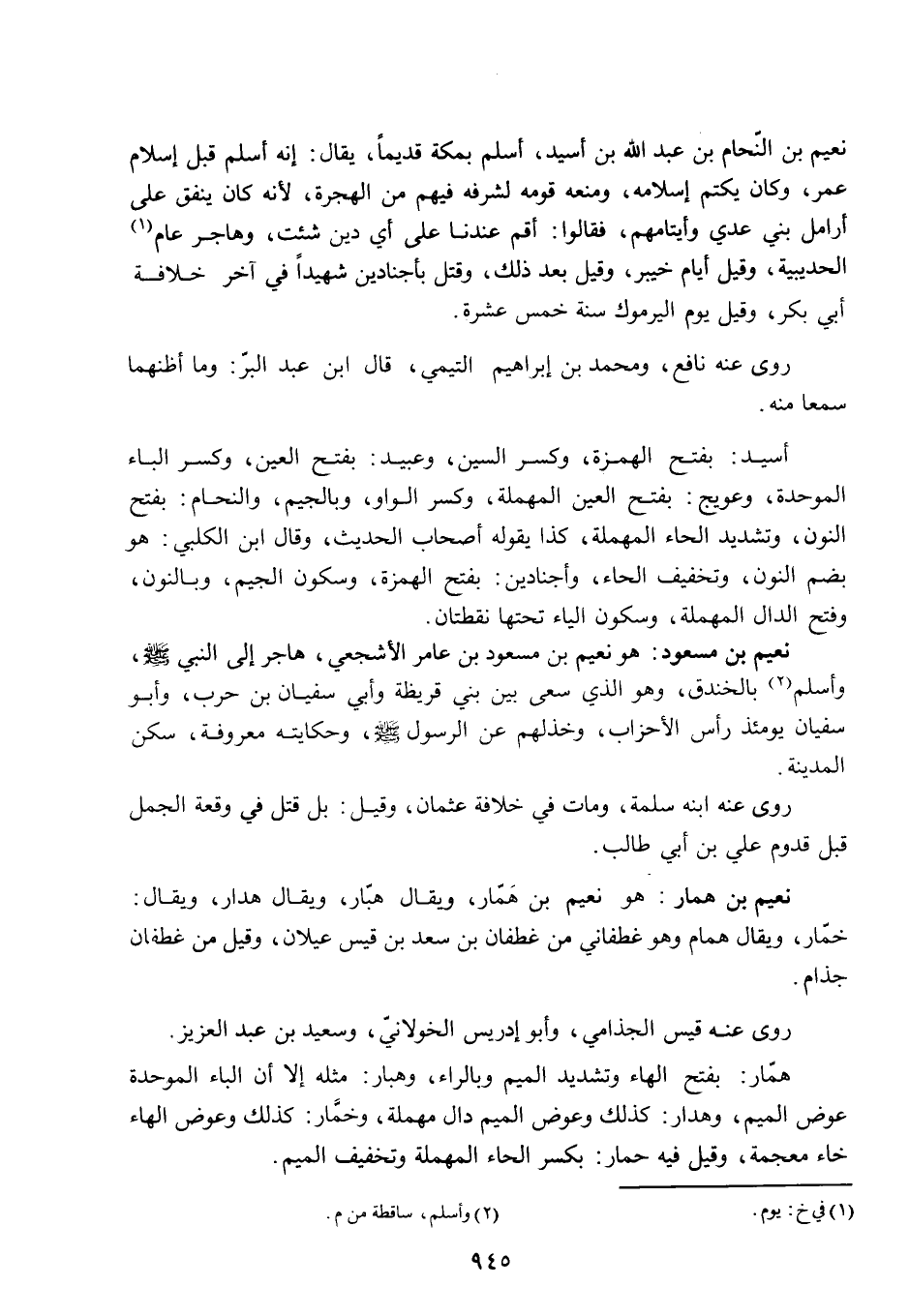 هو نُعَيْمُ بنُ مَسعودِ بن عامرِ الأَشْجَعيُّ. هاجرَ إلى النبي - صلى الله عليه وسلم- وأسلمَ (¬1) بالخندق وهو الذي سعى بين بني قريظةَ، وأبي سفيان بن حرب، وأبو سفيان يومئذ رأسُ الأحزاب. وخذَّلَهم عن رسول الله - صلى الله عليه وسلم-. وحكايتُه معروفة، سكن المدينة.