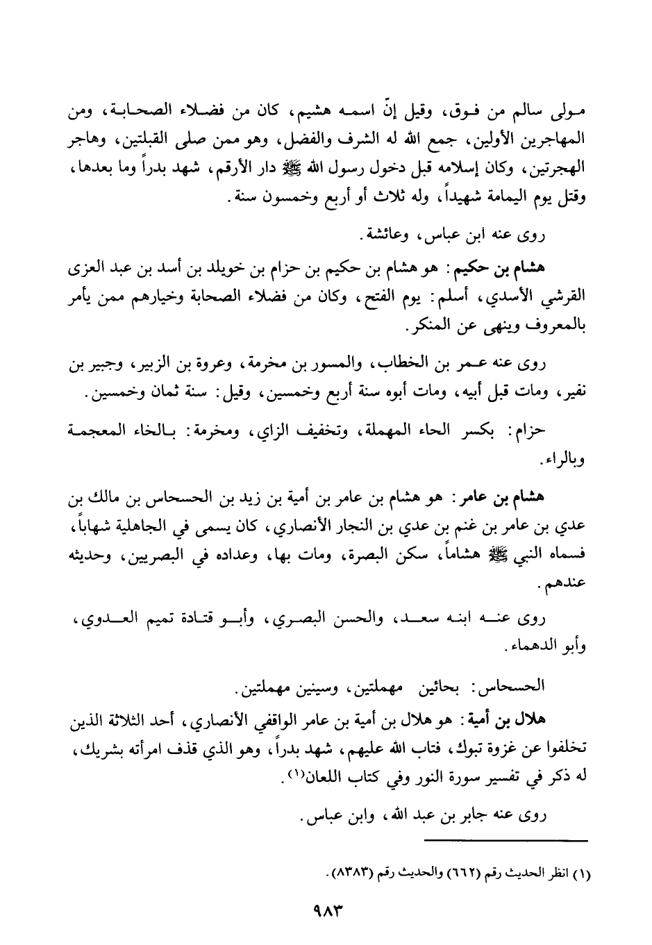 هو هلال بن أُميَّة بن عَامر الواقِفي الأَنْصاري، أحدُ الثلاثة الذي تخلفوا عن غزوة تبوك، فتاب الله عليهم، شهِدَ بدراً، وهو الذي قذفَ امرأته بشريك، له ذِكْر في سورة النور، وفي كتاب اللِّعان (¬1) .