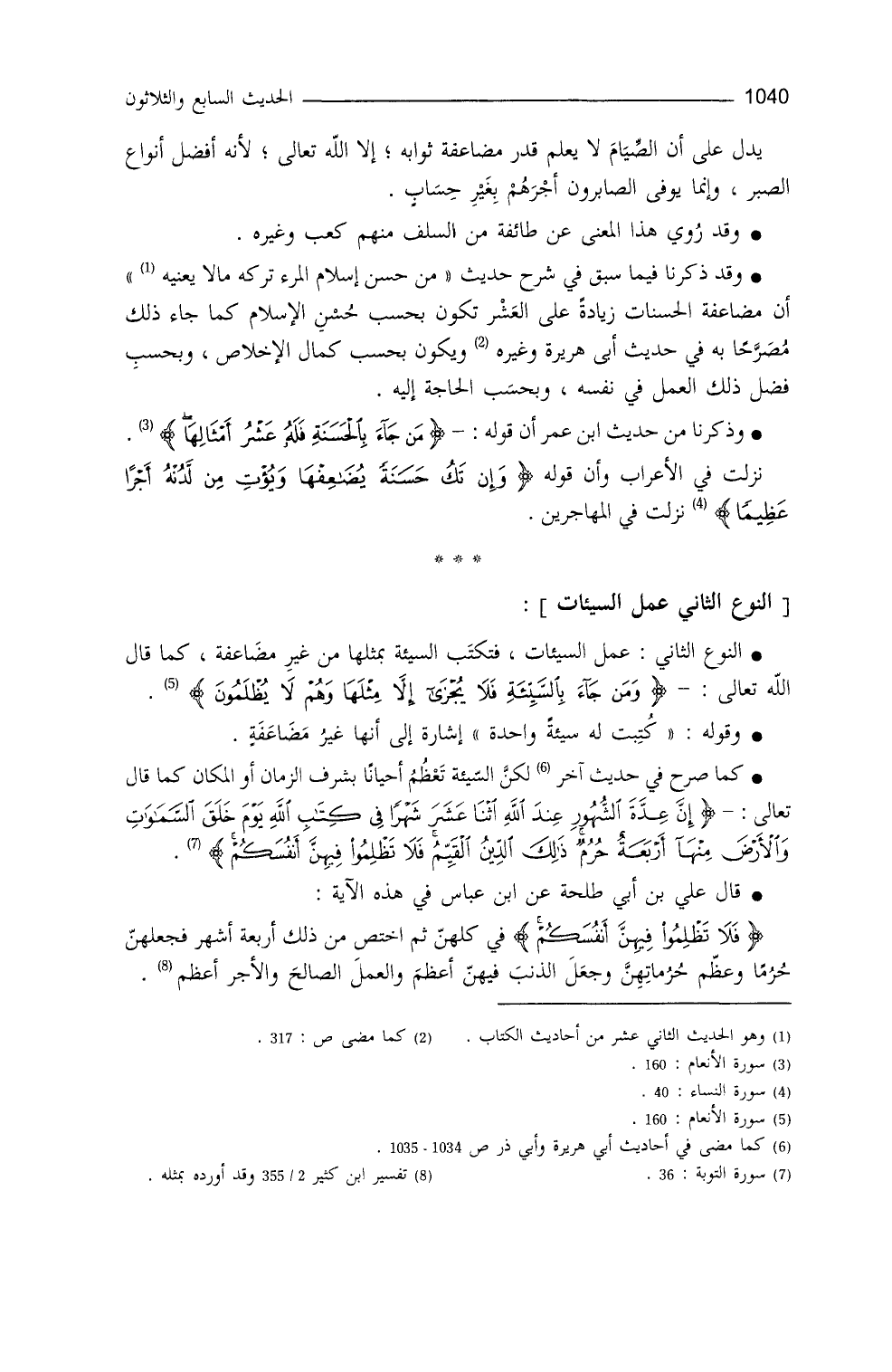 النوع الثاني: عمل السيِّئات، فتكتب السيِّئةُ بمثلها مِنْ غير مضاعفةٍ، كما قال تعالى: {وَمَنْ جَاءَ بِالسَّيِّئَةِ فَلا يُجْزَى إِلاَّ مِثْلَهَا وَهُمْ لا يُظْلَمُونَ} (¬7) .