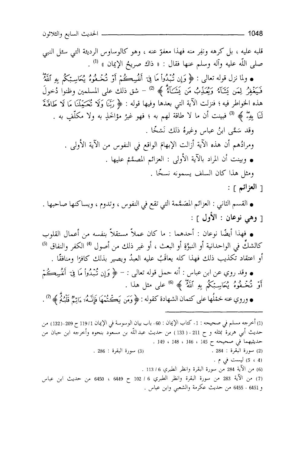 أحدهما: ما كان عملاً مستقلاً بنفسه من أعمالِ القلوب، كالشَّكِّ في الوحدانية، أو النبوَّة، أو البعث، أو غير ذلك مِنَ الكفر والنفاق، أو اعتقاد تكذيب ذلك، فهذا كلّه يُعاقَبُ عليه العبدُ، ويصيرُ بذلك كافراً ومنافقاً. وقد رُوي عن ابن عباس أنَّه حمل قوله تعالى: {وَإِنْ تُبْدُوا مَا فِي أَنْفُسِكُمْ أَو تُخْفُوهُ يُحَاسِبْكُمْ بِهِ اللهُ} (¬6) ، على مثل هذا (¬7) . وروي عنه حملُها على كتمان الشَّهادة لِقوله تعالى: {وَمَنْ يَكْتُمْهَا فَإِنَّهُ آثِمٌ قَلْبُهُ} (¬8) .