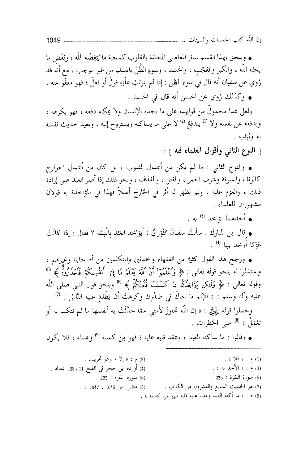 موجِب، مع أنَّه قد رُوي عن سفيان أنَّه قال في سُوء الظَّنِّ إذا لم يترتب عليه قولٌ أو فعلٌ، فهو معفوٌّ عنه. وكذلك رُوي عنِ الحسن أنه قال في الحسد، ولعلَّ هذا محمولٌ من قولهما على ما يجدُه الإنسانُ، ولا يمكنهُ دفعُه، فهو يكرهُه ويدفعُه عن نفسه، فلا يندفعُ إلاَّ على ما يساكِنُه، ويستروِحُ إليه، ويُعيدُ حديثَ نفسه به ويُبديه.