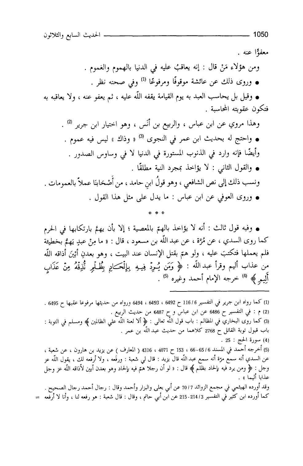 وفيه قول ثالث: أنَّه لا يُؤاخَذُ بالهمِّ بالمعصية إلاّ بأنْ يهِمَّ بارتكابها في الحَرَم، كما روى السُّديُّ، عن مرَّةَ، عن عبد الله بن مسعود، قال: ما من عبدٍ يهِمُّ بخطيئةٍ، فلم يَعمَلها، فتكتب عليه، ولو همَّ بقتل إنسان عندَ البيت، وهو بِعَدَنِ أَبْيَنَ، أذاقَهُ الله من عذابٍ أليم، وقرأ عبدُ الله: {وَمَنْ يُرِدْ فِيهِ بِإِلْحَادٍ بِظُلْمٍ نُذِقْهُ مِنْ عَذَابٍ أَلِيمٍ} (¬2) . خرَّجه الإمام أحمد (¬3) وغيره.
