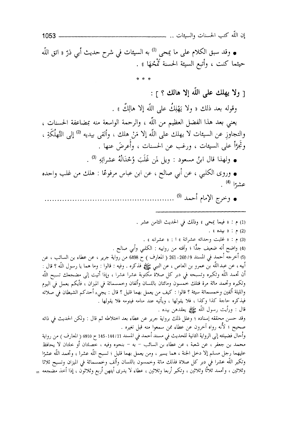 وقوله بعد ذلك: ((ولا يَهلِكُ على الله إلاّ هالكٌ)) : يعني بعد هذا الفضل العظيم من الله، والرحمة الواسعة منه بمضاعفة الحسنات، والتَّجاوز عن السيِّئات، لا يَهلِكُ على الله إلاّ من هلك، وألقى بيده إلى التَّهلُكة، وتجرَّأ على السيِّئات، ورَغِبَ عن الحسنات، وأعرض عنها. ولهذا قال ابنُ مسعود (¬2) : ويلٌ لمن غلب وحْدانُه عشراته. وروى الكلبيُّ عن أبي صالح عن ابن عباس، مرفوعاً: ((هَلَكَ مَنْ غلَبَ واحدُهُ عشراً)) (¬3) .