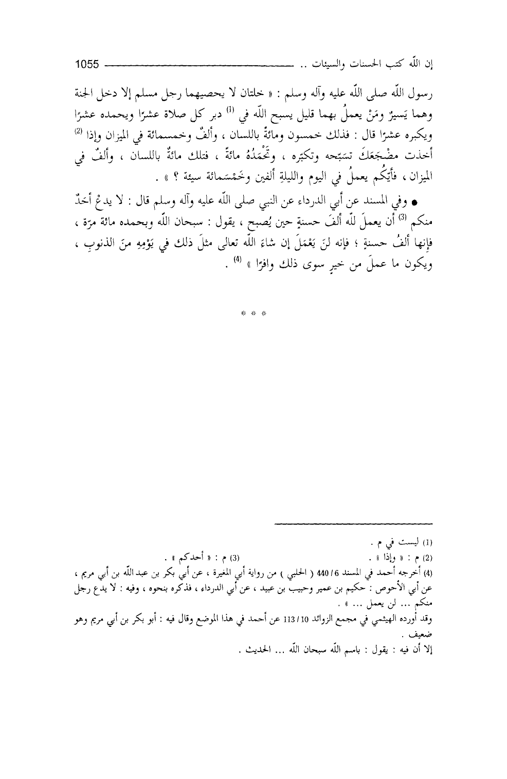 وفي " المسند " (¬1) عن أبي الدرداء، عن النَّبيِّ - صلى الله عليه وسلم -، قال: ((لا يَدَعْ (¬2) أحدٌ منكم أنْ يعمل لله ألف حسنة حين يُصبح يقول: سبحانَ الله وبحمده مئة مرة، فإنَّها ألفُ حسنةٍ، فإنَّه لنْ يعمل إنْ شاءَ الله تعالى مثل ذلك في يومه من الذنوب، ويكون ما عمل من خير سوى ذلك وافراً)) .