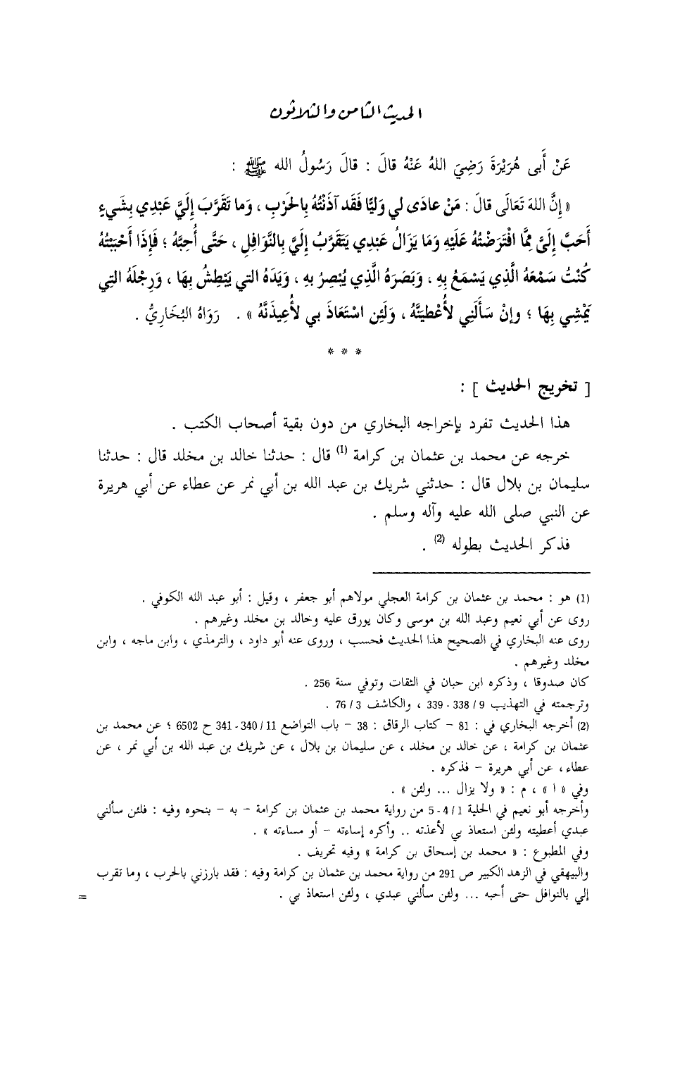 عَنْ أَبِي هُريرة - رضي الله عنه - قالَ: قَالَ رَسولُ اللهِ - صلى الله عليه وسلم -: ((إنَّ الله تَعالَى قَالَ: مَنْ عَادَى لِي وَلِيّاً، فَقَدْ آذنتُهُ بالحربِ، وما تَقَرَّب إليَّ عَبْدِي بشيءٍ أحَبَّ إليَّ مِمَّا افترضتُ عَليهِ، ولا يَزالُ عَبْدِي يَتَقرَّبُ إليَّ بالنَّوافِلِ حتَّى أُحِبَّهُ، فإذا أَحْبَبْتُهُ، كُنتُ سَمعَهُ الّذي يَسمَعُ بهِ، وبَصَرَهُ الّذي يُبْصِرُ بهِ، ويَدَهُ الَّتي يَبطُشُ بها، ورِجْلَهُ الّتي يَمشي بِها، ولَئِنْ سأَلنِي لأُعطِيَنَّهُ، ولَئِنْ استَعاذَنِي لأُعِيذَنَّهُ)) . رواهُ البخاريُّ (¬1) .