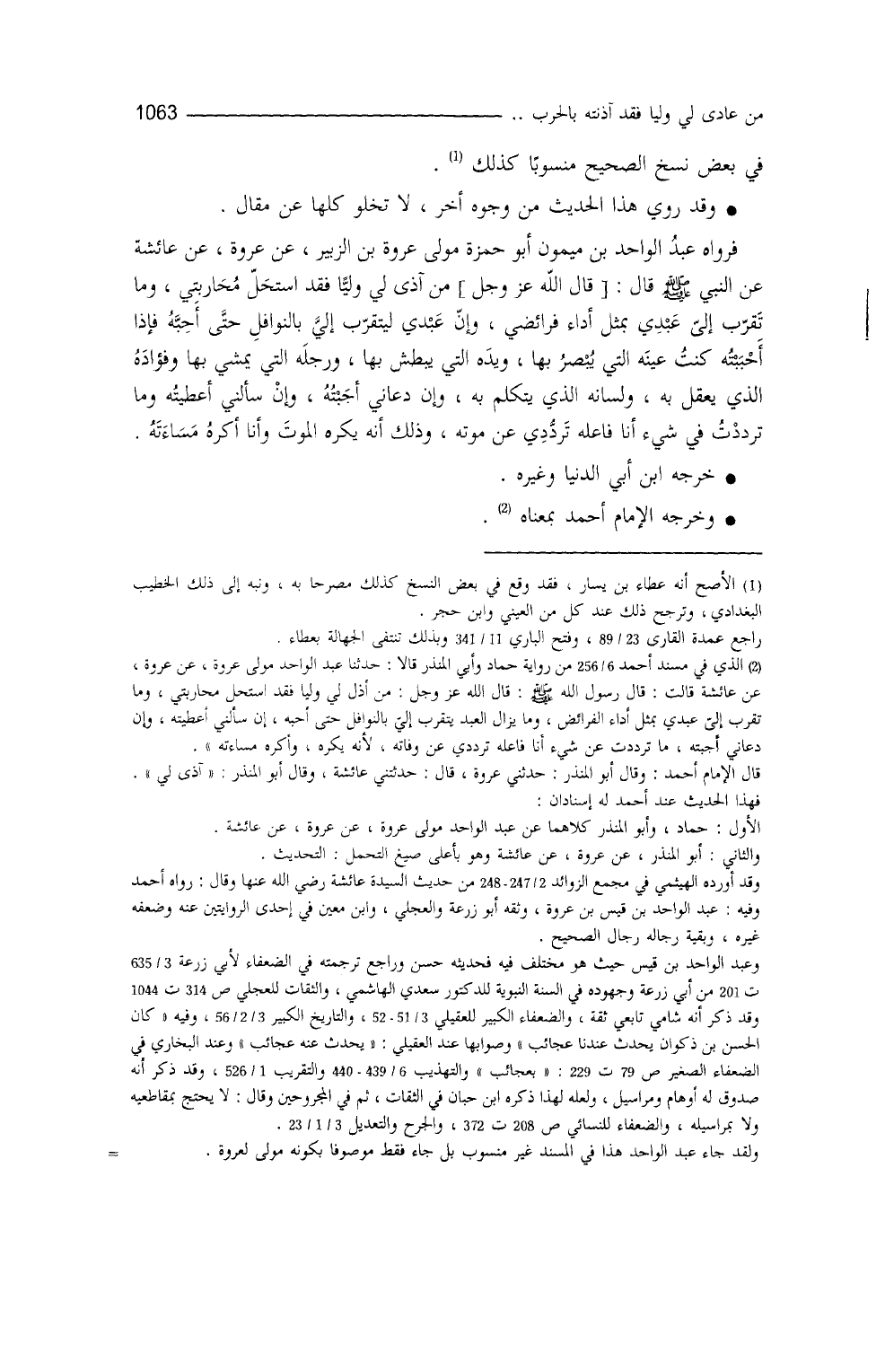 عبدُ الواحد بن ميمون أبو حمزة مولى عروةَ بن الزُّبير عن عروة، عن عائشة، عن النَّبيِّ - صلى الله عليه وسلم -، قال: ((من آذى لي ولياً، فقد استحلَّ محاربتي، وما تقرَّب إليَّ