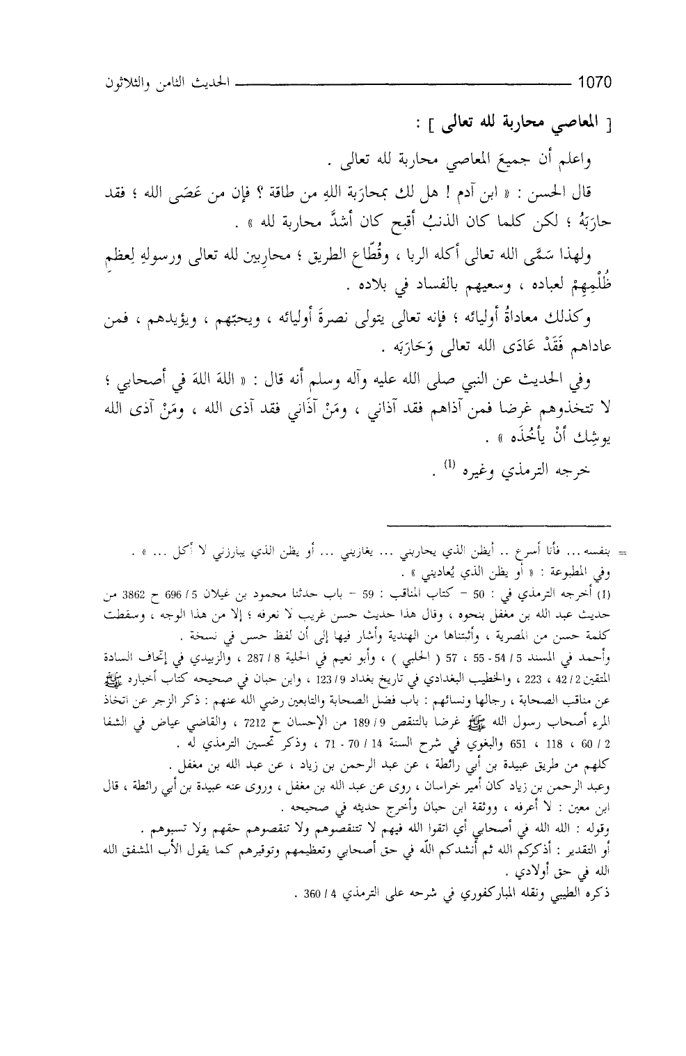 بمحاربة الله من طاقةٍ؟ فإنَّ مَنْ عصى الله، فقد حاربه، لكن كلَّما كانَ الذَّنبُ أقبحَ، كانت المحاربة لله أشد ولهذا سمّى الله تعالى أَكَلةَ الرِّبا، وقُطَّاع الطَّريق محاربينَ لله تعالى ورسوله؛ لعظيم ظلمهم لعباده، وسعيهم بالفساد في بلاده، وكذلك معاداةُ أوليائه، فإنَّه تعالى يتولَّى نُصرةَ أوليائه، ويُحبهم ويؤيِّدُهم، فمن عاداهم، فقد عادى الله وحاربه، وفي الحديث عن النَّبيِّ - صلى الله عليه وسلم -، قال: ((اللهَ اللهَ في أصحابي، لا تتَّخذوهُم غرضاً، فمن آذاهم فقد آذاني، ومن آذاني فقد آذى الله، ومن آذى الله