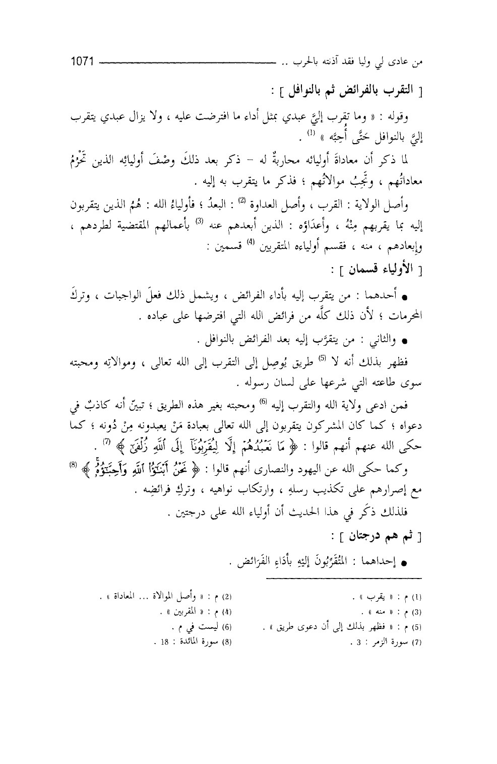 وقوله: ((وما تقرَّب إليَّ عبدي بمثل أداءِ ما افترضتُ عليه، ولا يزالُ عبدي يتقرَّبُ إليَّ بالنَّوافل حتّى أحبَّه)) (¬1) : لمَّا ذكر أنَّ معاداة أوليائه محاربةٌ له، ذكر بعد ذلك وصفَ أوليائه الذين تحرُم معاداتُهُم، وتجب موالاتُهم، فذكر ما يتقرَّب به إليه، وأصلُ الولاية: القربُ، وأصلُ العداوة: البعدُ، فأولياء الله هُمُ الذين يتقرَّبون إليه بما يقرِّبهم منه، وأعداؤه الذين أبعدهم عنه بأعمالهم المقتضية لطردهم وإبعادهم منه، فقسم أولياءه المقربين إلى قسمين: