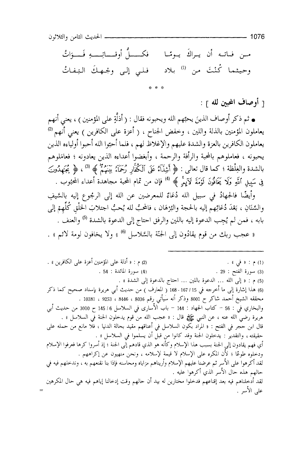 الْمُؤْمِنِينَ} (¬1) ، يعني أنَّهم يعامِلون المؤمنين بالذِّلَّة واللِّين وخفض الجناح، {أَعزَّة على الكافرين} (¬2) ، يعني أنَّهم يعاملون الكافرين بالعزَّة والشدَّة عليهم، والإغلاظ لهم، فلما أحبُّوا الله، أحبُّوا أولياءه الذين يُحبونه، فعاملوهُم بالمحبَّة، والرَّأفة، والرحمة، وأبغضوا أعداءه الذين يُعادونه، فعاملُوهم بالشِّدَّة والغِلظة، كما قال تعالى: {أَشِدَّاءُ عَلَى الْكُفَّارِ رُحَمَاءُ بَيْنَهُمْ} (¬3) {يُجَاهِدُونَ فِي سَبِيلِ اللهِ وَلا يَخَافُونَ لَوْمَةَ لائِمٍ} (¬4) ، فإنَّ من تمام المحبة مجاهدةَ أعداءِ المحبوب، وأيضاً، فالجهادُ في سبيل الله دعاء للمعرضين عن الله إلى الرجوع إليه بالسَّيفِ والسِّنان بعد دعائهم إليه بالحجَّةِ والبرهانِ، فالمحبُّ لله يحبُّ اجتلابَ الخلق كلِّهم إلى بابه؛ فمن لم يُجبِ الدعوةَ باللين والرِّفق، احتاج إلى الدعوة بالشدّة والعنف: ((عجب ربّك من قومٍ يُقادون إلى الجنّة بالسَّلاسل)) (¬5) .