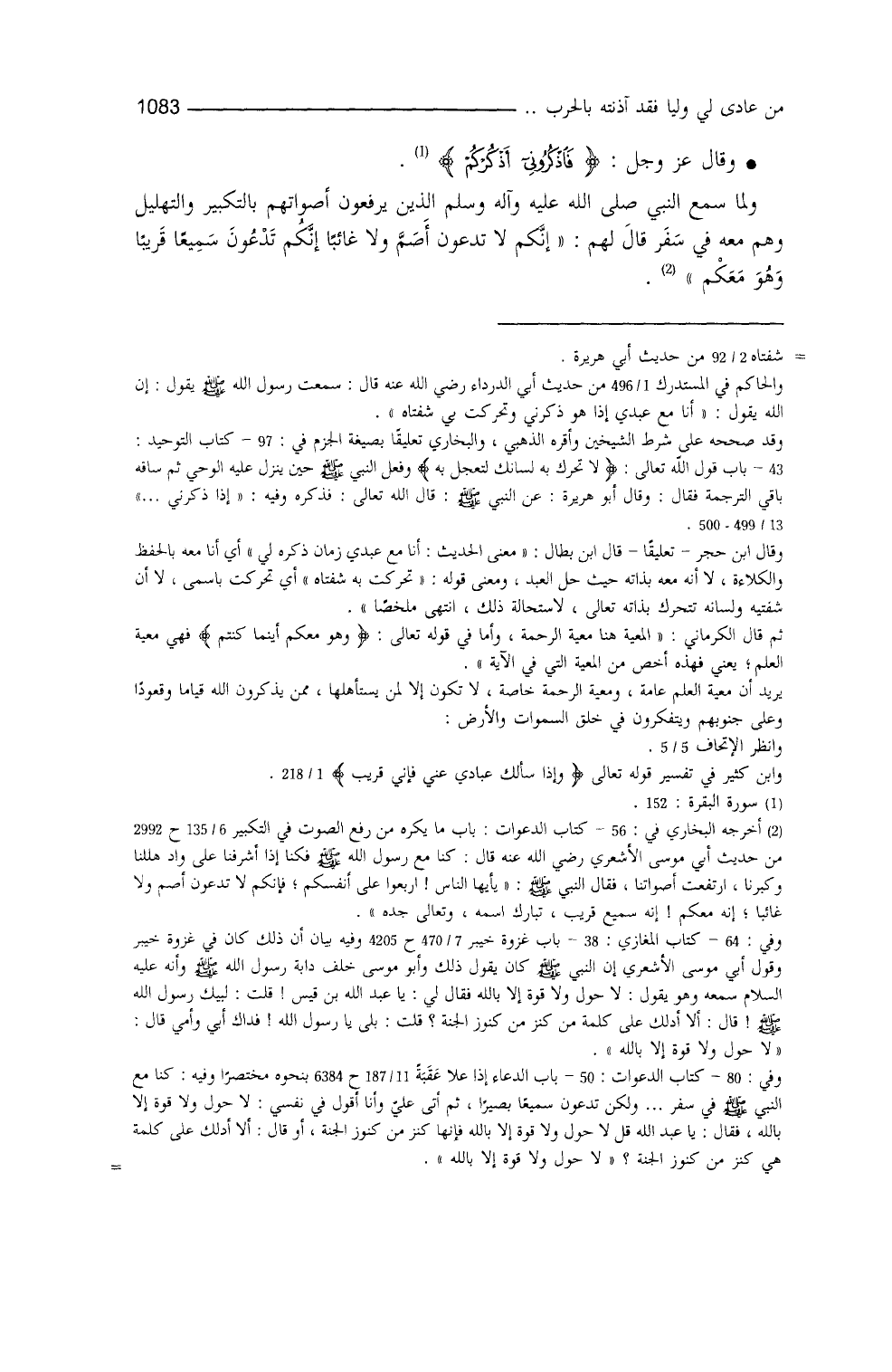ولما سمع النَّبيُّ - صلى الله عليه وسلم - الذين يرفعون أصواتهم بالتَّكبير والتَّهليل وهُمْ معه في سفر، قال لهم: ((إنكم لا تدعون أصمَّ ولا غائباً، إنَّكم تدعون سميعاً قريباً، وهو
