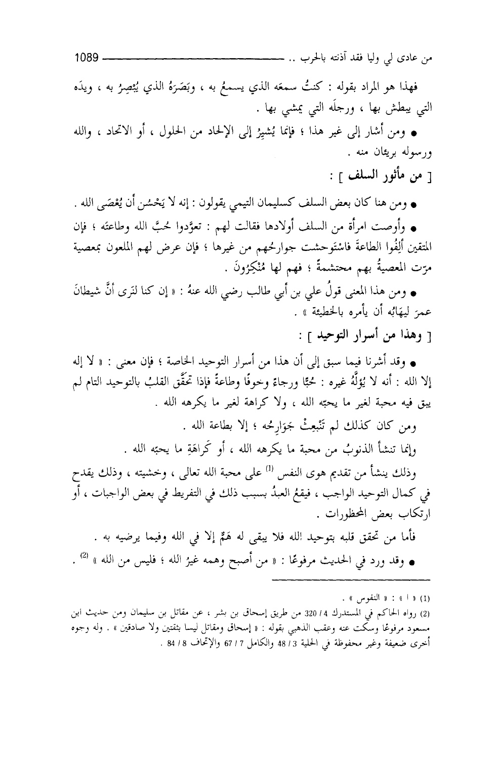 فهذا هو المرادُ بقوله: ((كنت سمعه الذي يسمعُ به، وبصره الذي يُبصرُ به، ويده التي يبطش بها، ورجلَه التي يمشي بها)) (¬1) ، ومن أشار إلى غير هذا، فإنَّما يُشير إلى الإلحاد مِنَ الحلول، أو الاتِّحاد، والله ورسولُه بريئان منه.