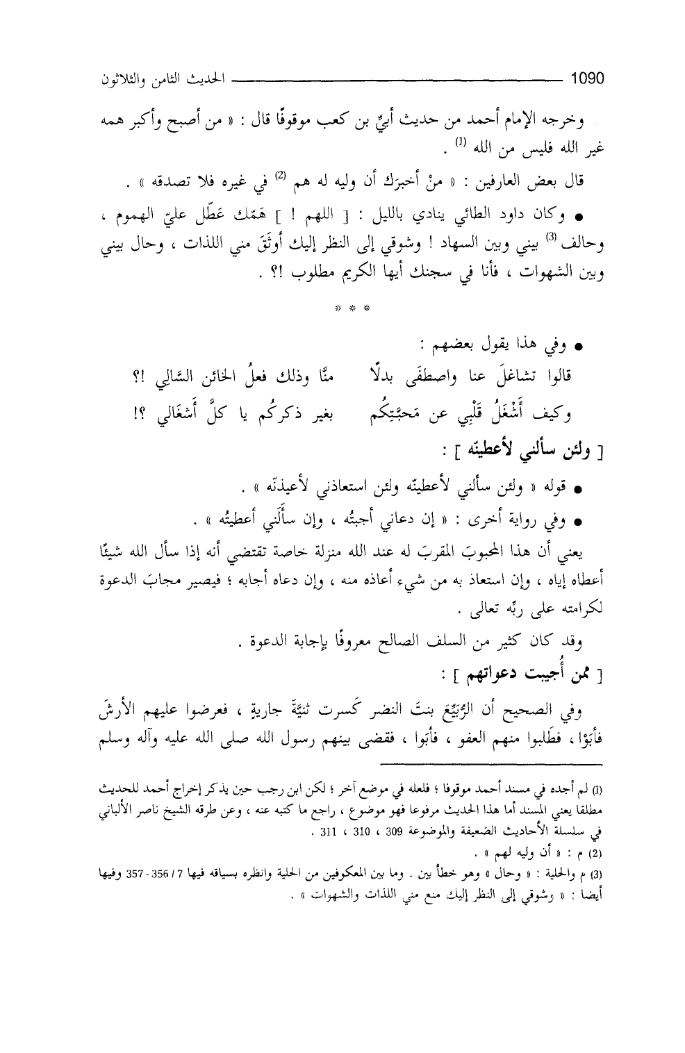 كان داود الطائي يُنادي بالليل: همُّك عَطَّل عليَّ الهمومَ، وحالف بيني وبين السُّهاد، وشوقي إلى النَّظر إليك أوثق مني اللذات، وحالَ بيني وبين الشهوات، فأنا في سجنك أيها الكريم مطلوب (¬1) ، وفي هذا يقول بعضهم: