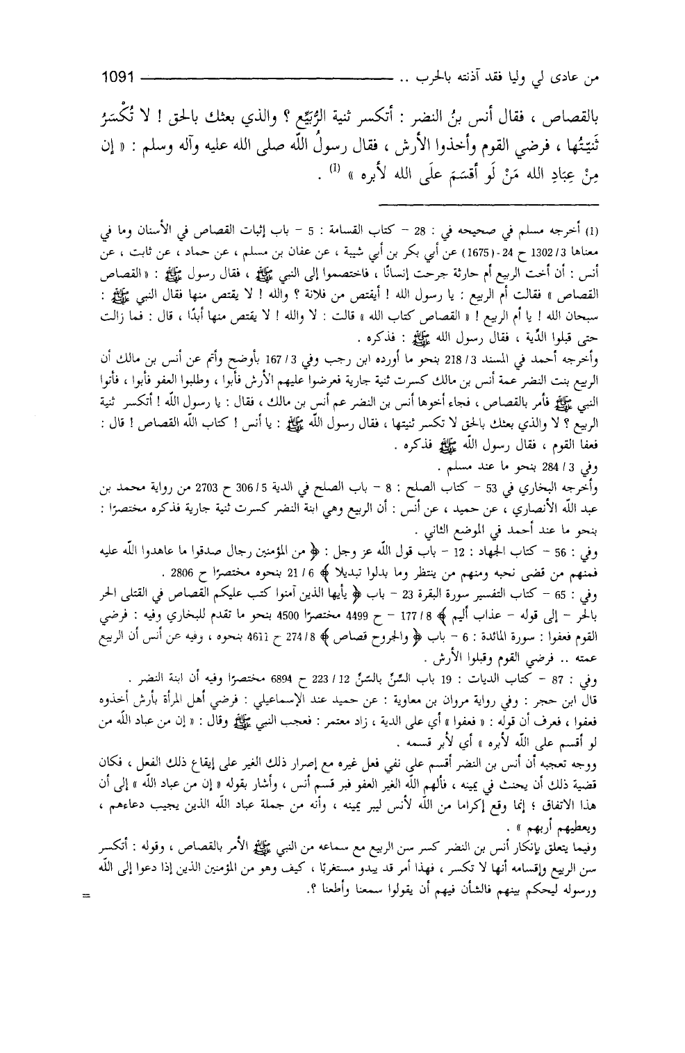 بالقصاصِ، فقال أنس بن النضر: أتكسر ثَنِيَّة الرُّبيع؟ والذي بعثك بالحقِّ لا تُكسر ثنيَّتُها، فرضي القومُ، وأخذوا الأرش، فقال رسولُ الله - صلى الله عليه وسلم -: ((إنَّ من عبادِ الله مَنْ لو أقسمَ على الله لأبرَّه)) .