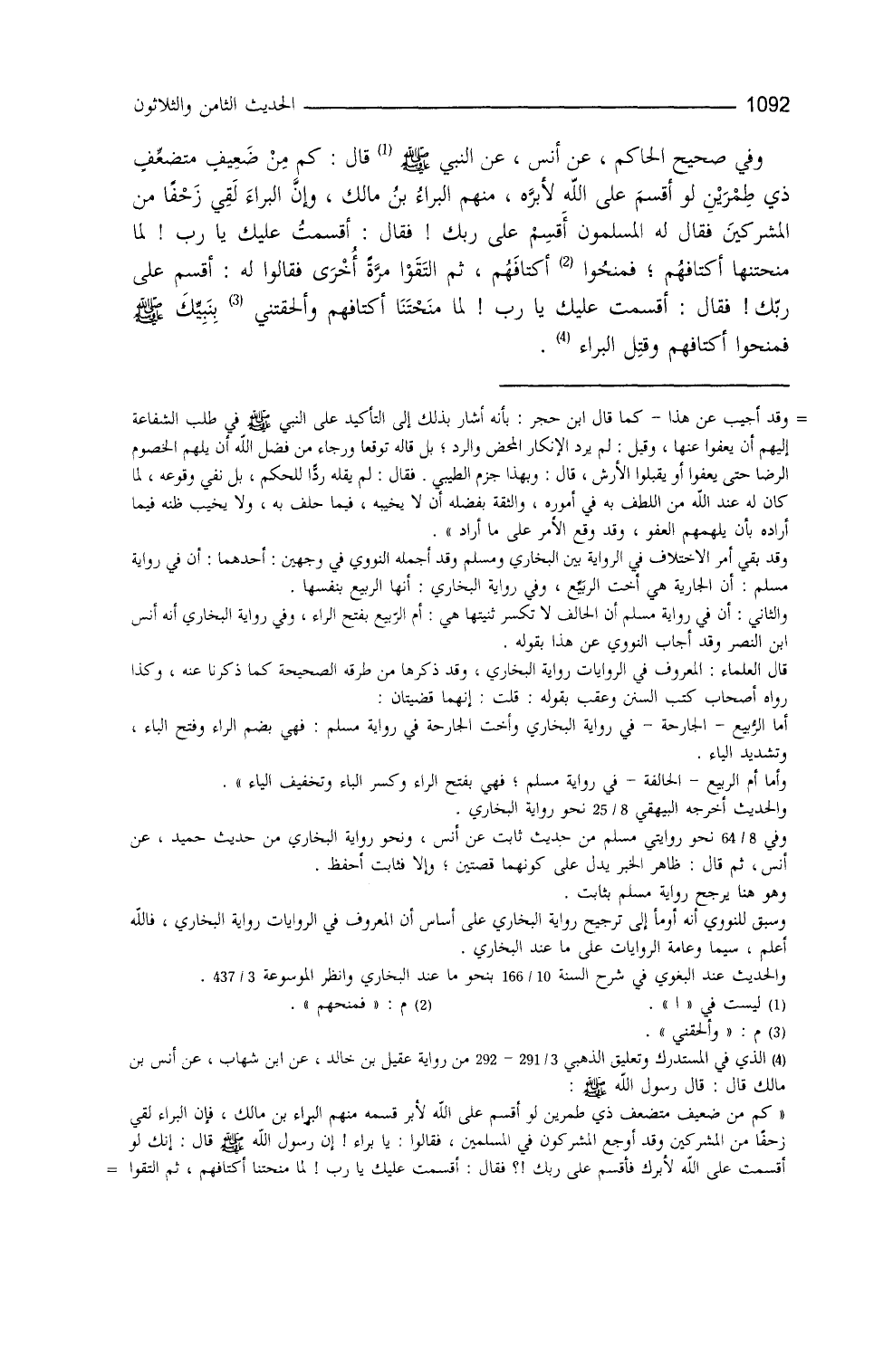 عن أنس، عن النَّبيِّ - صلى الله عليه وسلم -، قال: ((كَمْ من ضعيفٍ مُتَضعَّفٍ ذي طِمرين لو أقسم على الله لأبرَّه، منهم البراءُ بن مالك)) ، وأنَّ البراء لقي زحفاً من المشركين، فقال له المسلمون: أقسِمْ على ربِّك، فقال: أقسمتُ عليك يا ربِّ لما منحتنا أكتافَهُم، فمنحهم أكتافَهم، ثم التقوا مرّة أخرى، فقالوا: أَقسِمْ على ربِّك، فقال: أقسمتُ عليك يا ربِّ لما منحتنا أكتافهم، وألحقتني بنبيِّك - صلى الله عليه وسلم -، فمنحوا أكتافهم، وقُتِلَ البراء.