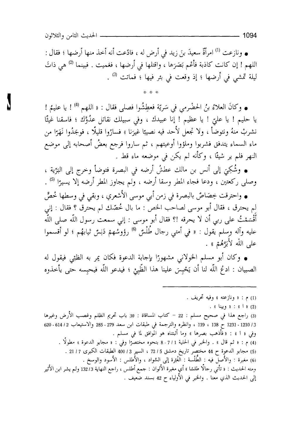 ونازعت امرأةٌ سعيدَ بن زيد في أرضٍ له، فادَّعت أنَّه أخذ منها أرضَهَا، فقال: اللَّهمَّ إنْ كانت كاذبةً، فاعم بصرها، واقتلها في أرضها، فعَمِيَت، وبينا هي ذات ليلة تمشي في أرضها إذ وقعت في بئر فيها، فماتت (¬1) .