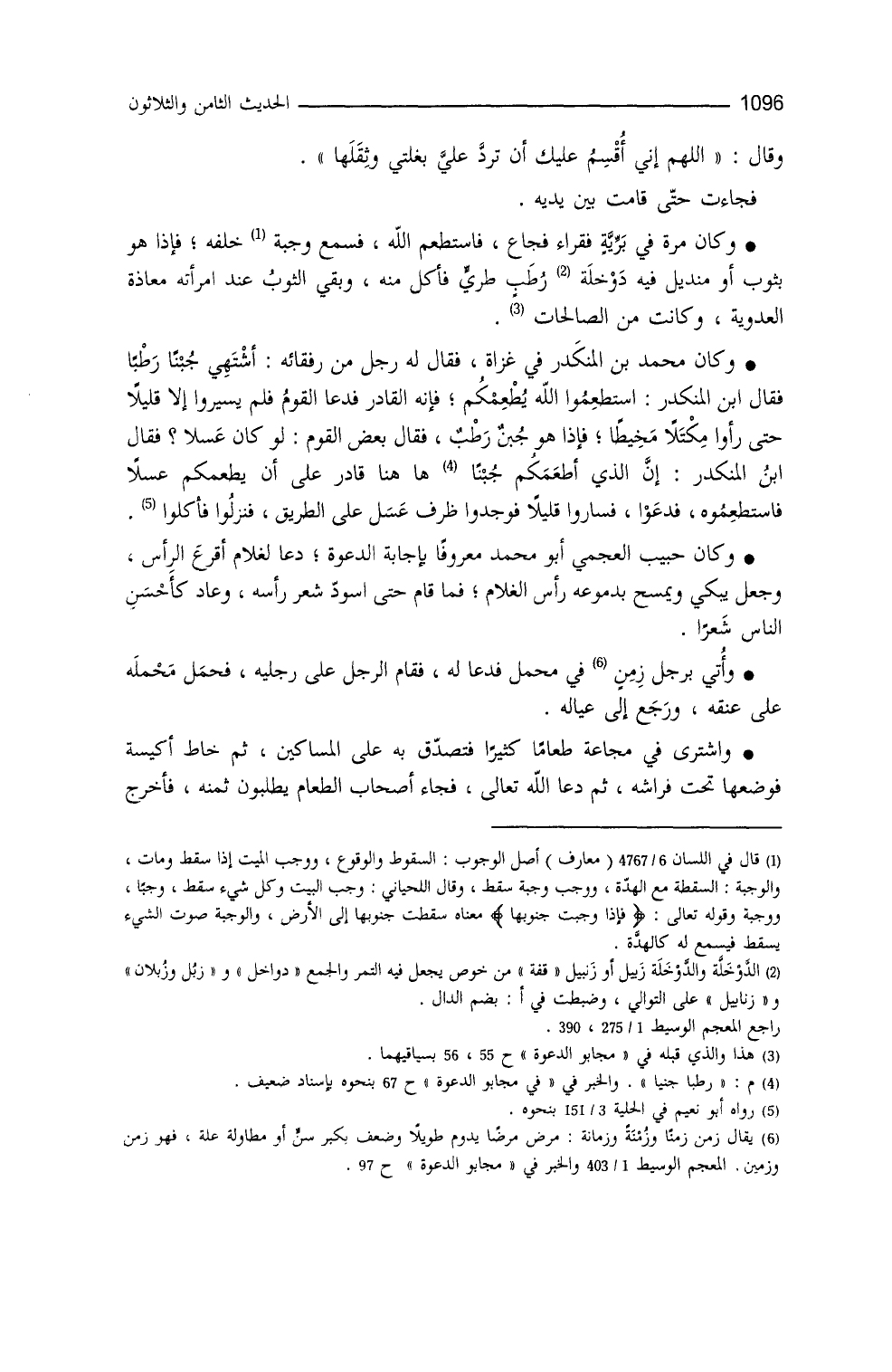 وكان محمدُ بنُ المنكدر في غزاة، فقال له رجل من رُفقائِه: اشتهي جُبناً رطباً، فقال ابنُ المنكدر: استطعموا الله يُطعِمكُم، فإنَّه القادر، فدعا القومُ، فلم يسيروا إلا قليلاً، حتَّى رأوا مِكتلاً مخيطاً، فإذا هو جبنٌ رطبٌ، فقال بعضُ القوم: لو كان عسلاً فقال ابن المنكدر: إنّ الذي أطعمكم جبناً هاهنا قادرٌ على أن يُطعِمَكم
